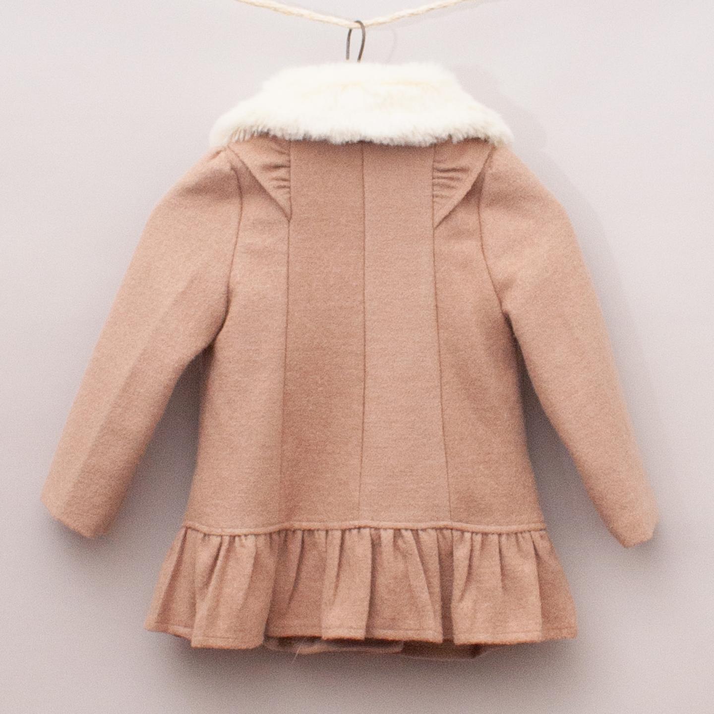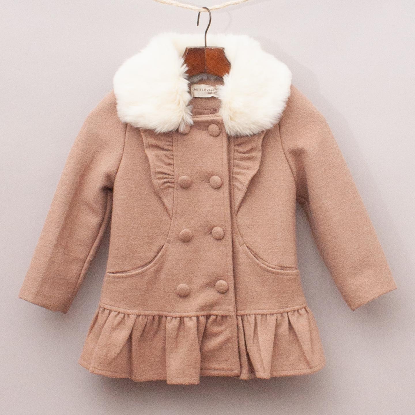Petit Lievre brown coat with ruffle hemline and details down the front, faux fur removable collar, two front pockets and full button down front
