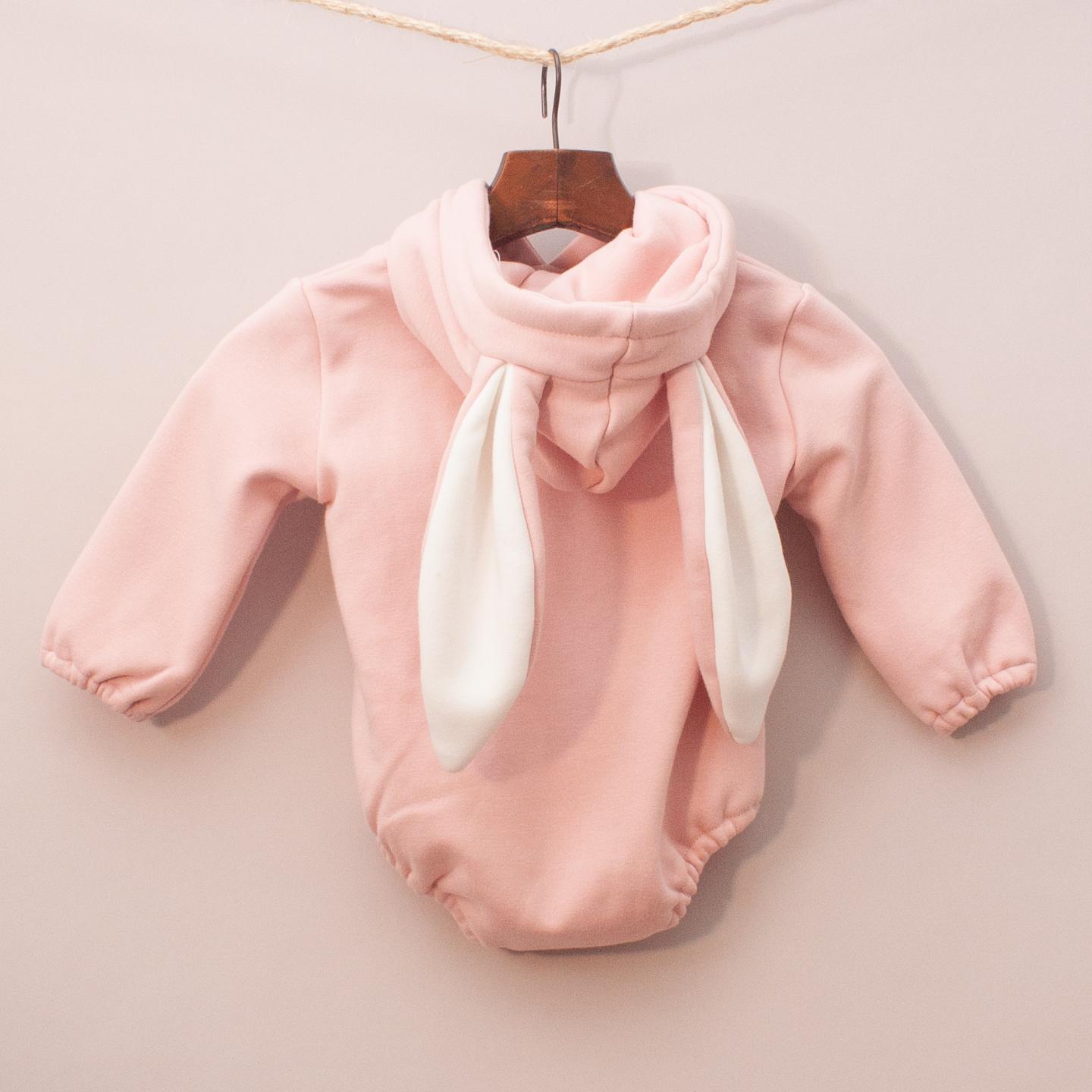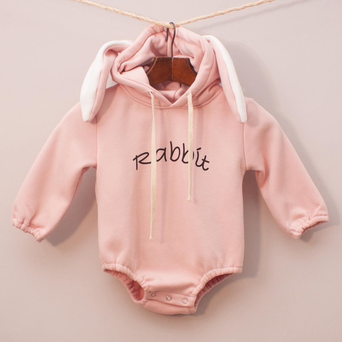 Pink hooded long sleeve romper with printed rabbit across the front with snap button closures