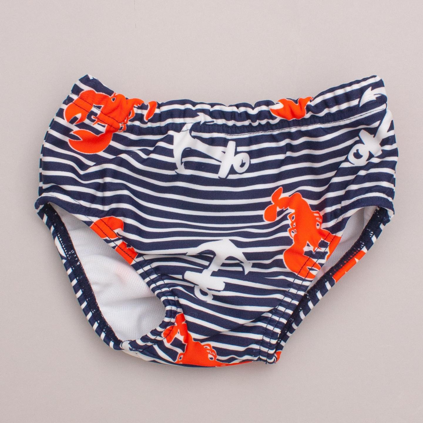 Platypus navy blue and white striped speedos with orange lobster print throughout and elastic waistband