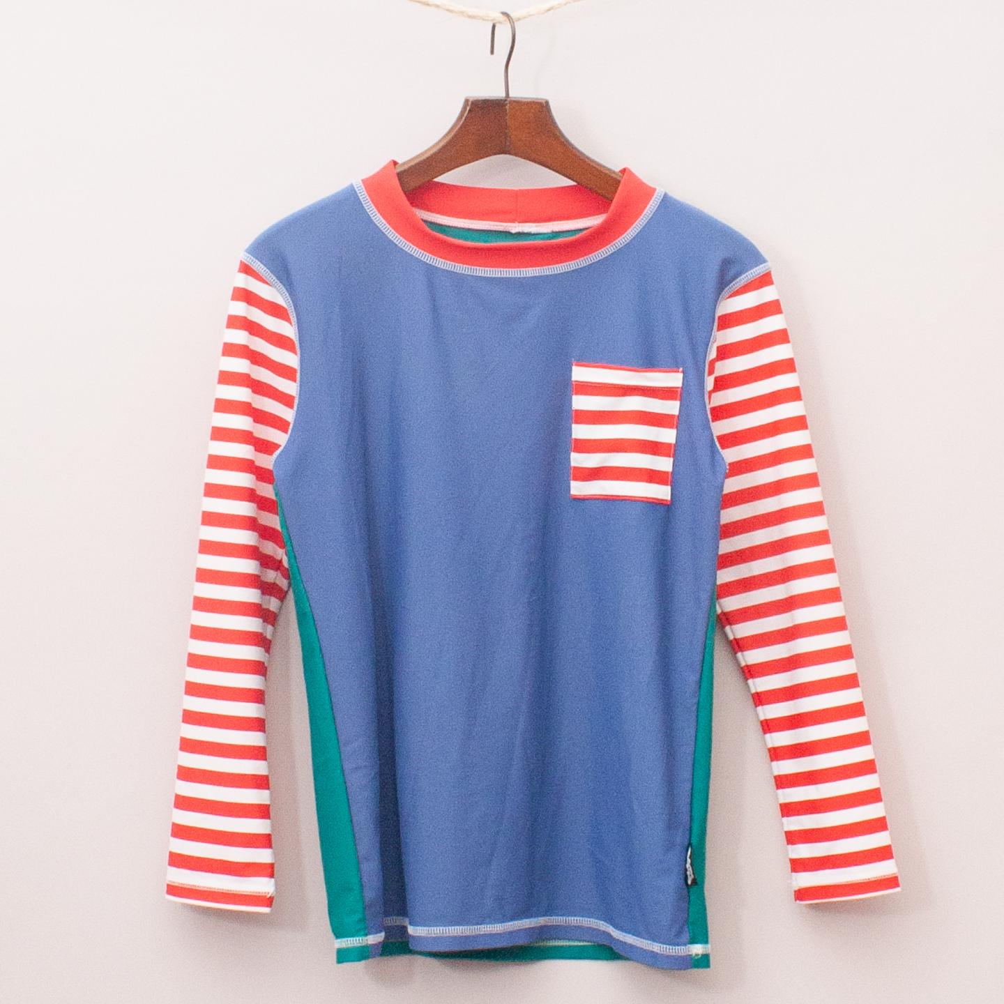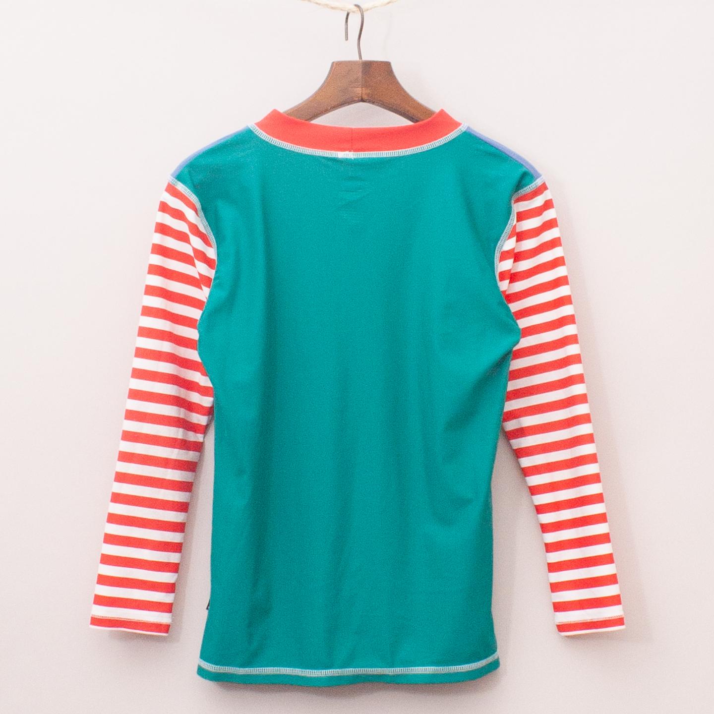 Platypus red, white and blue long sleeve rash vest with striped sleeves and green back