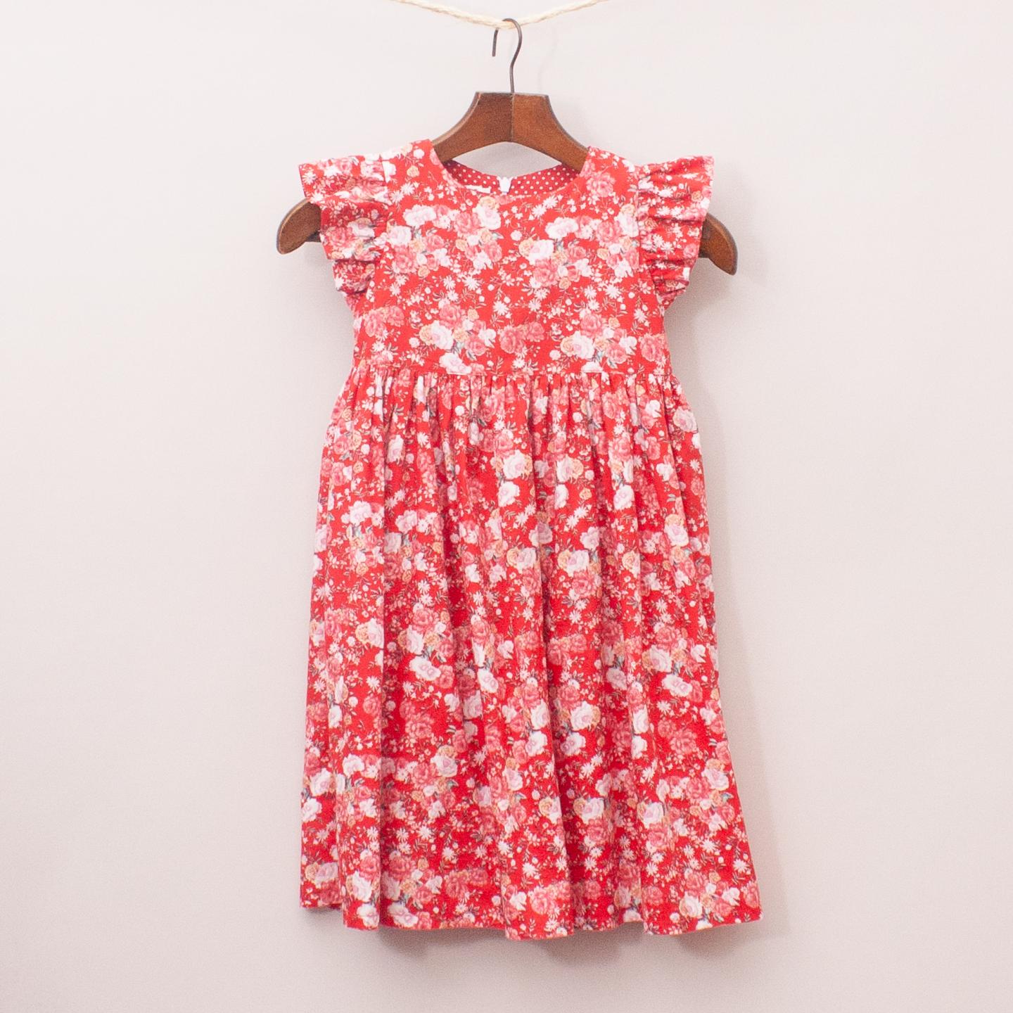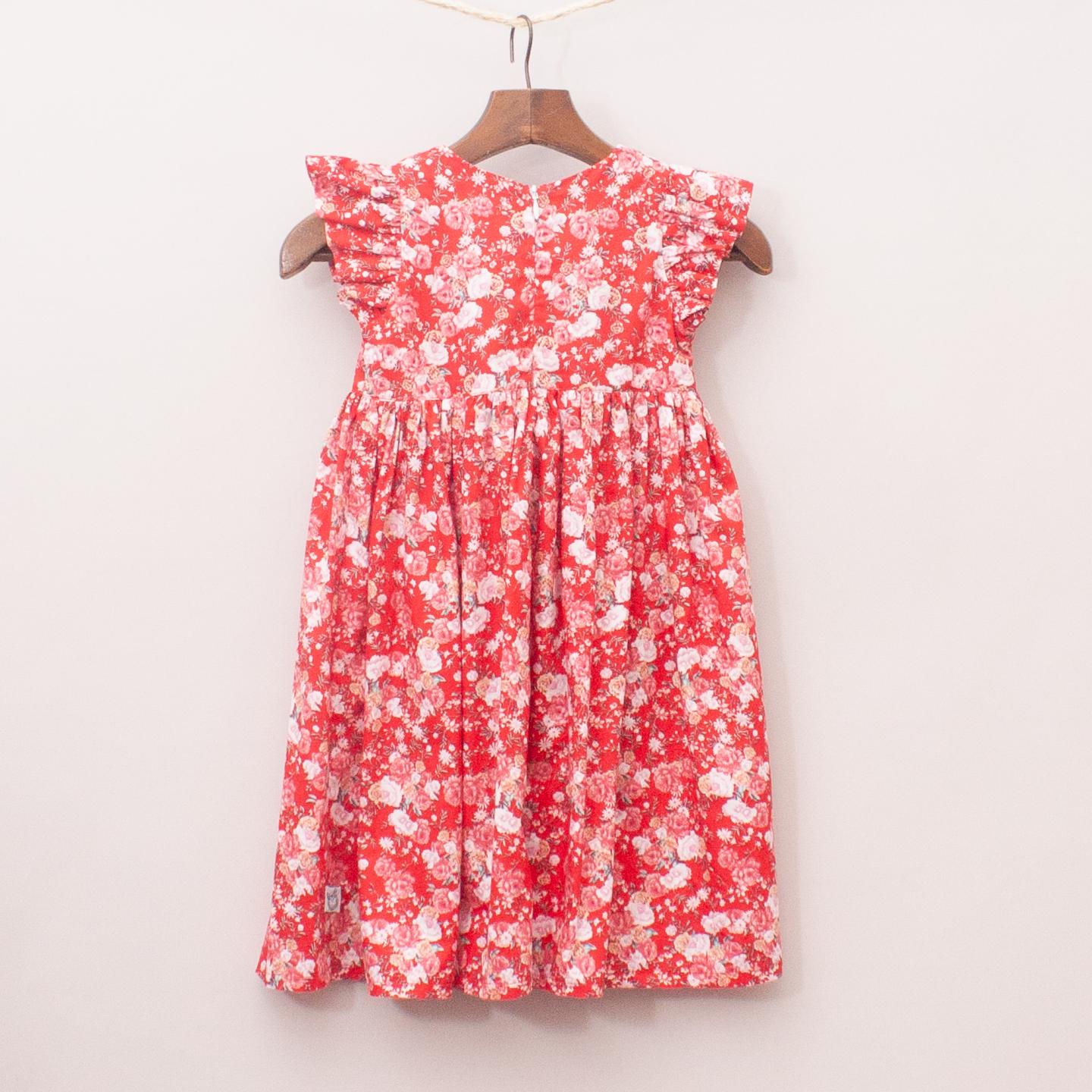 Pour Bebe red and floral patterned dress with ruffle sleeves, gathered skirt and zip back closure *100% Cotton