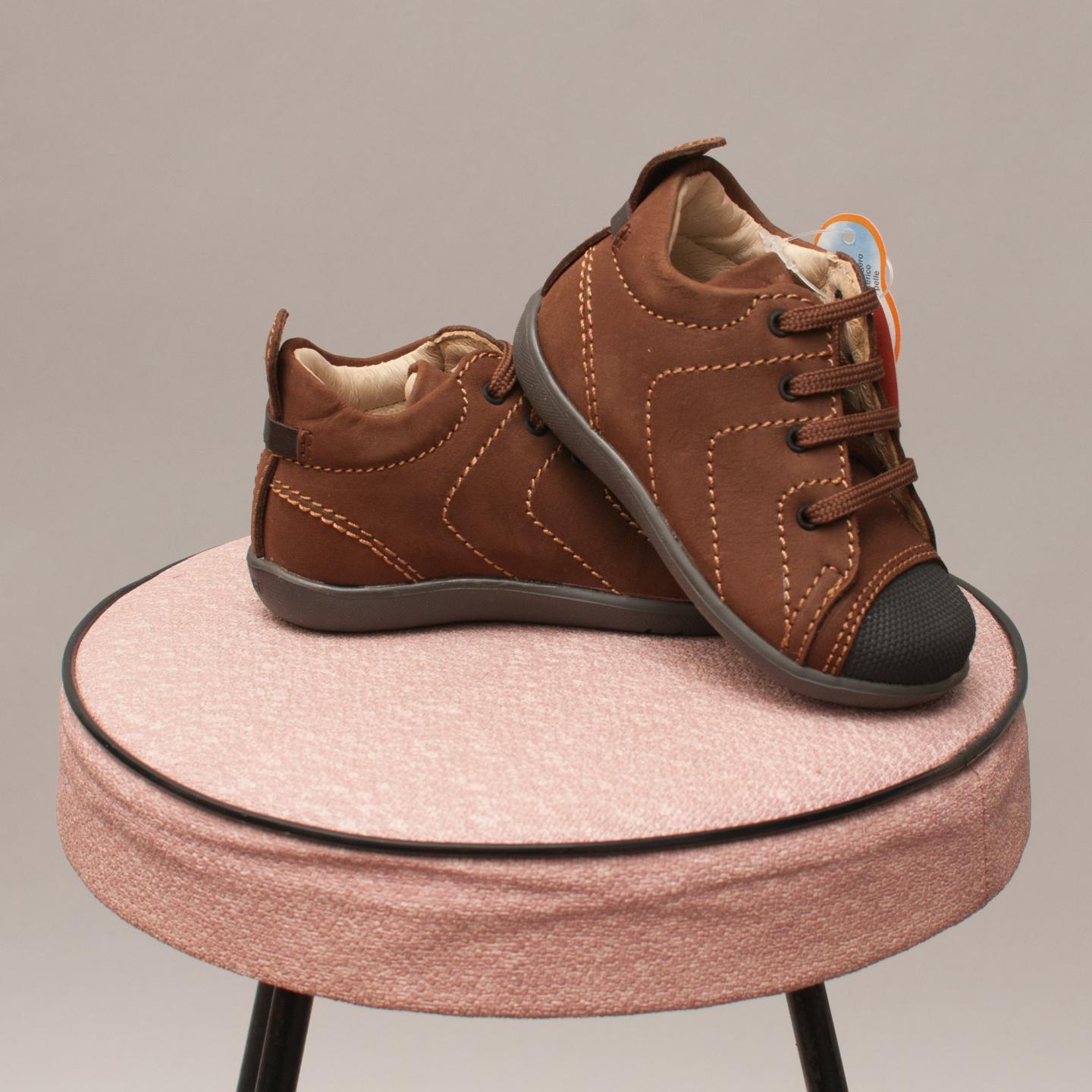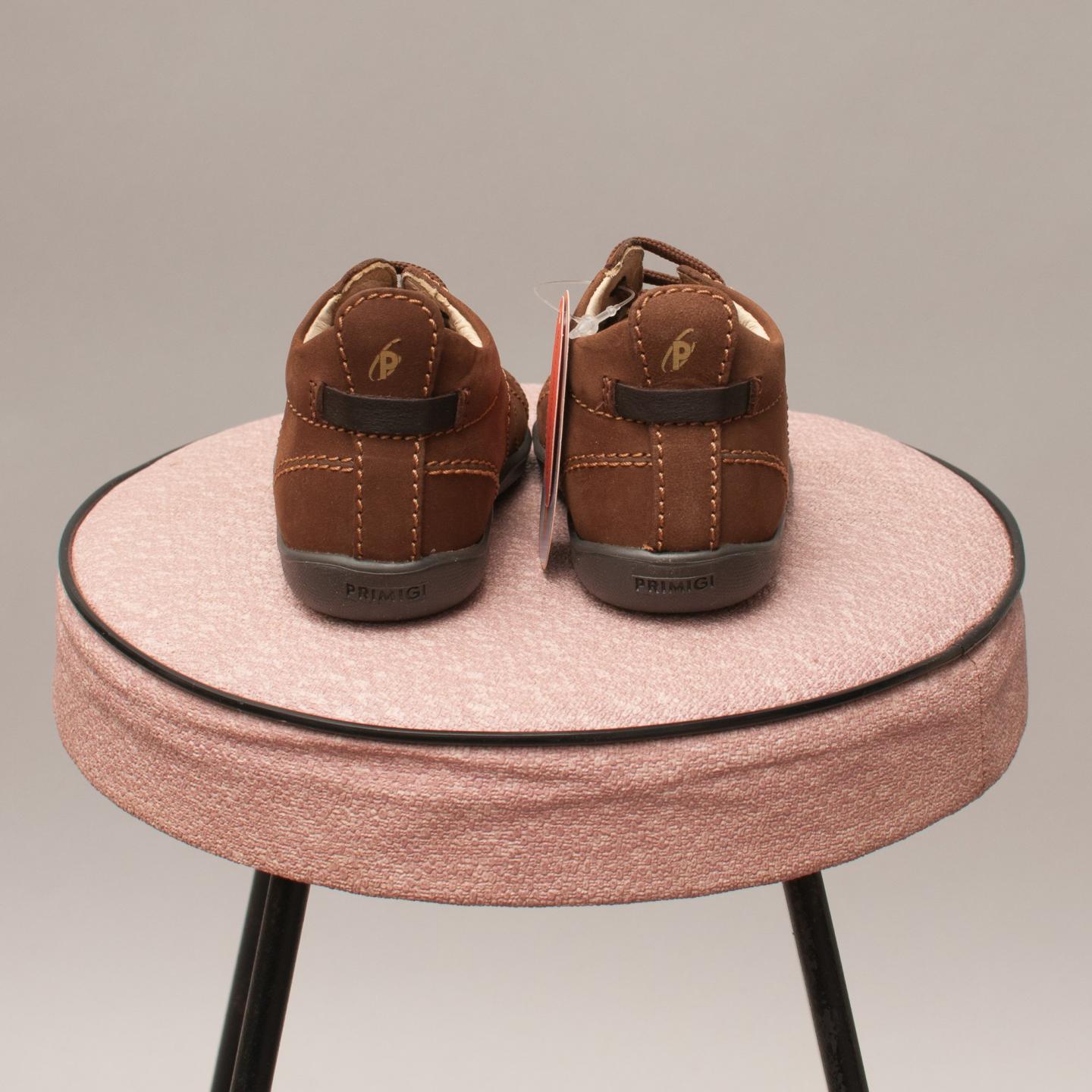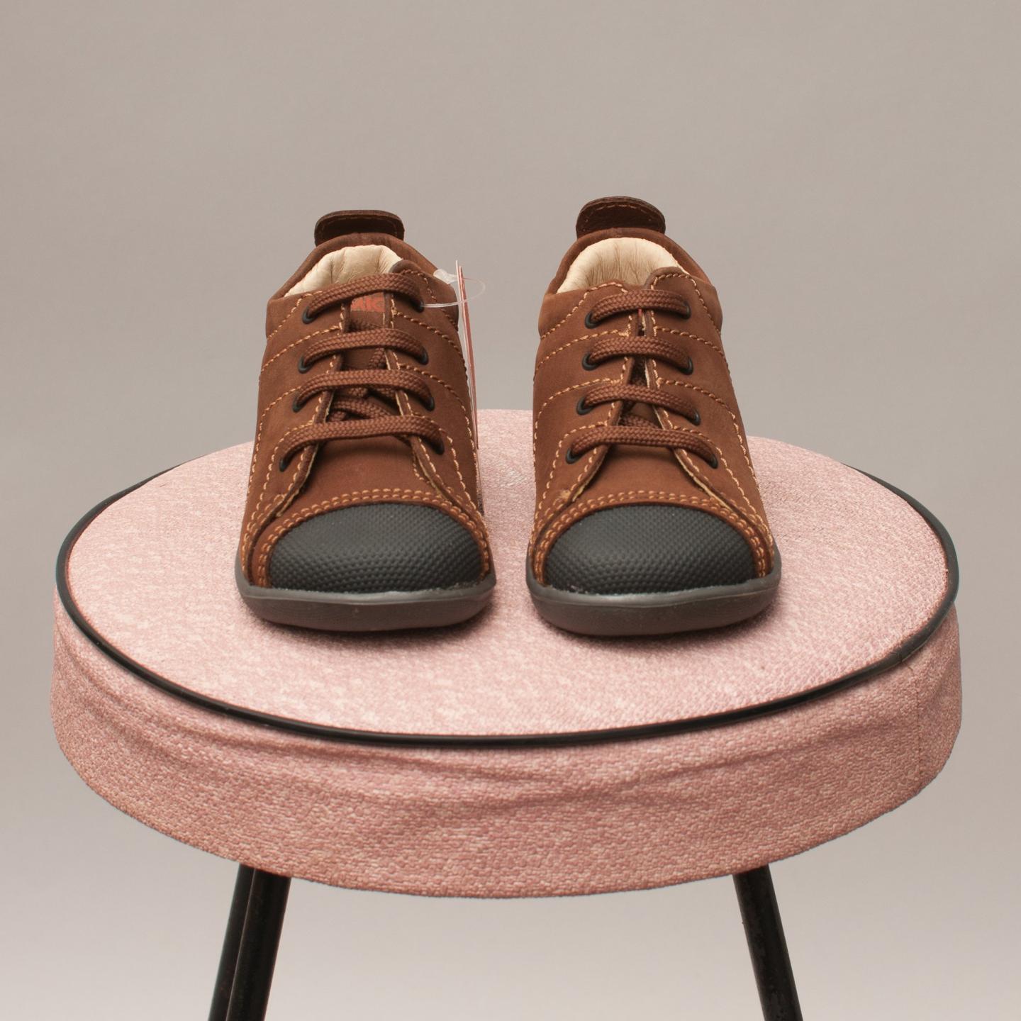 Primigi "brand new in box" chocolate brown nubuck leather lace up shoes with black rubber toe and brown stitching details. European Size 19 (0-12Mths Approx.)