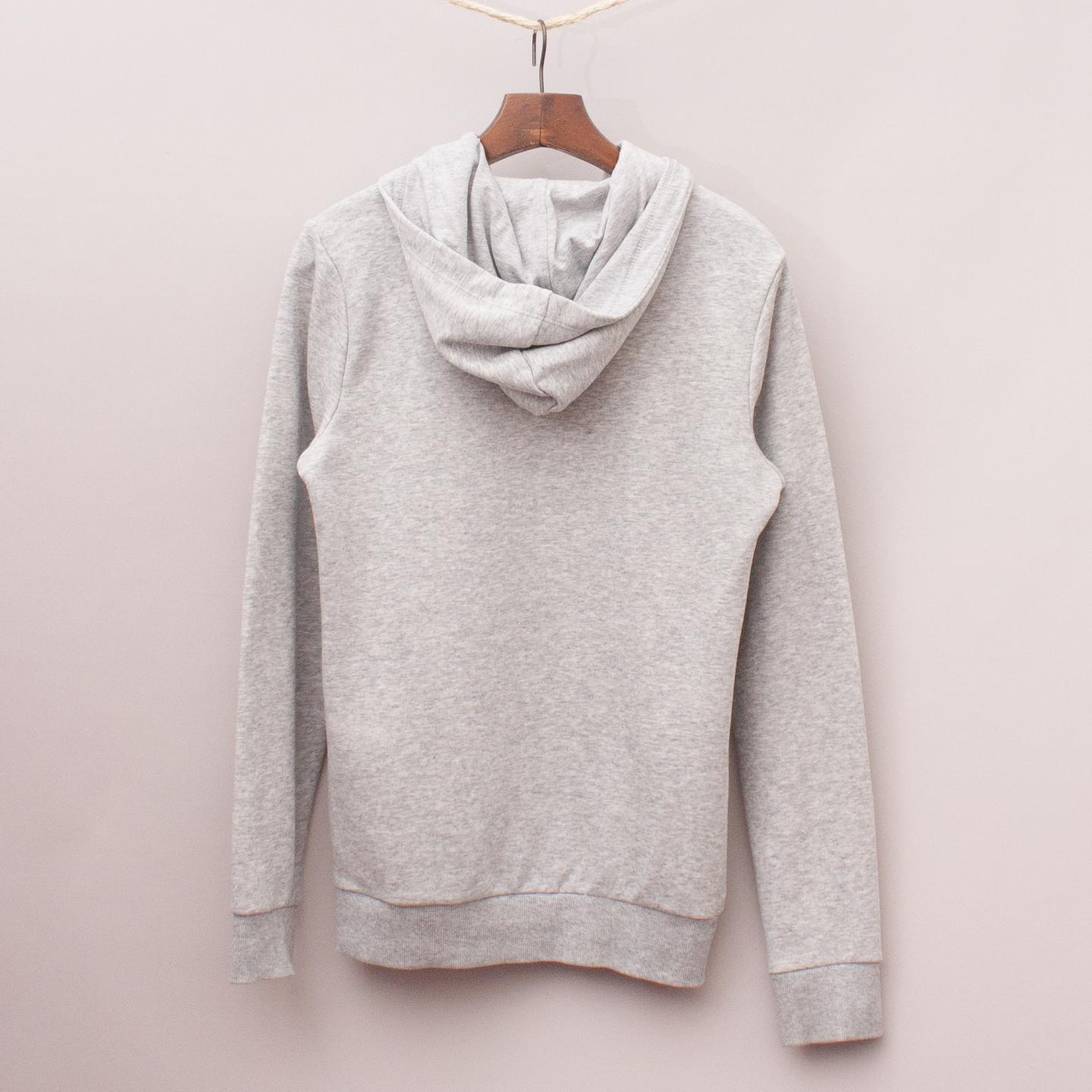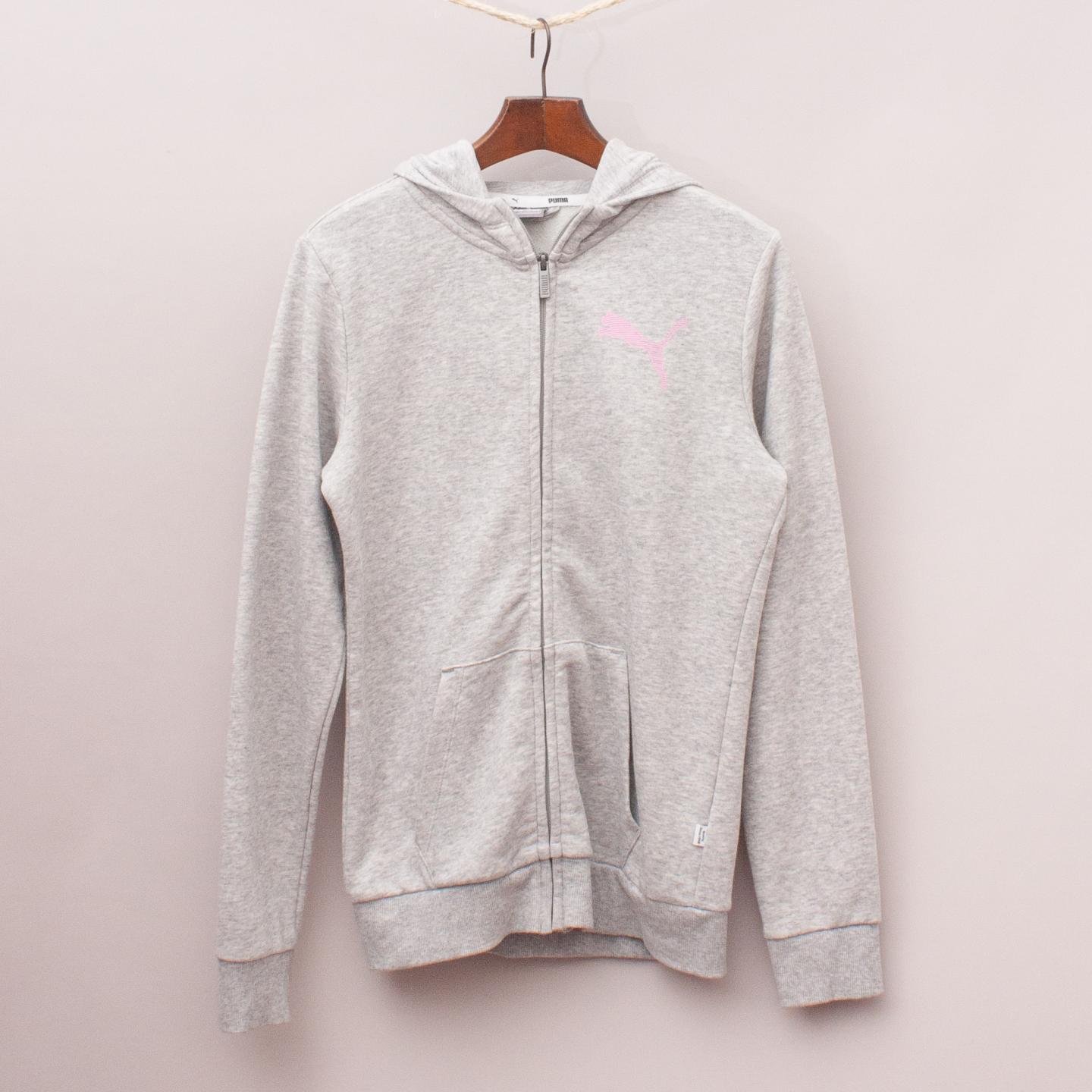 Puma grey marle hooded jumper with two front pockets, pink printed logo on the front and full zip up front *68% Cotton, 32% Polyester