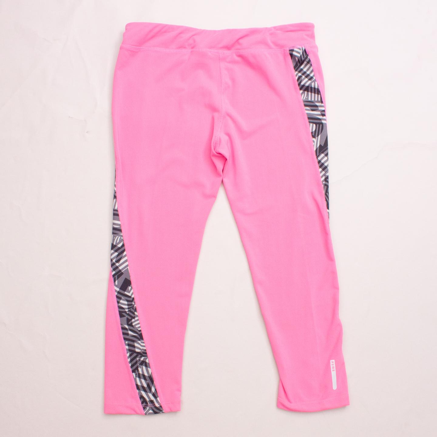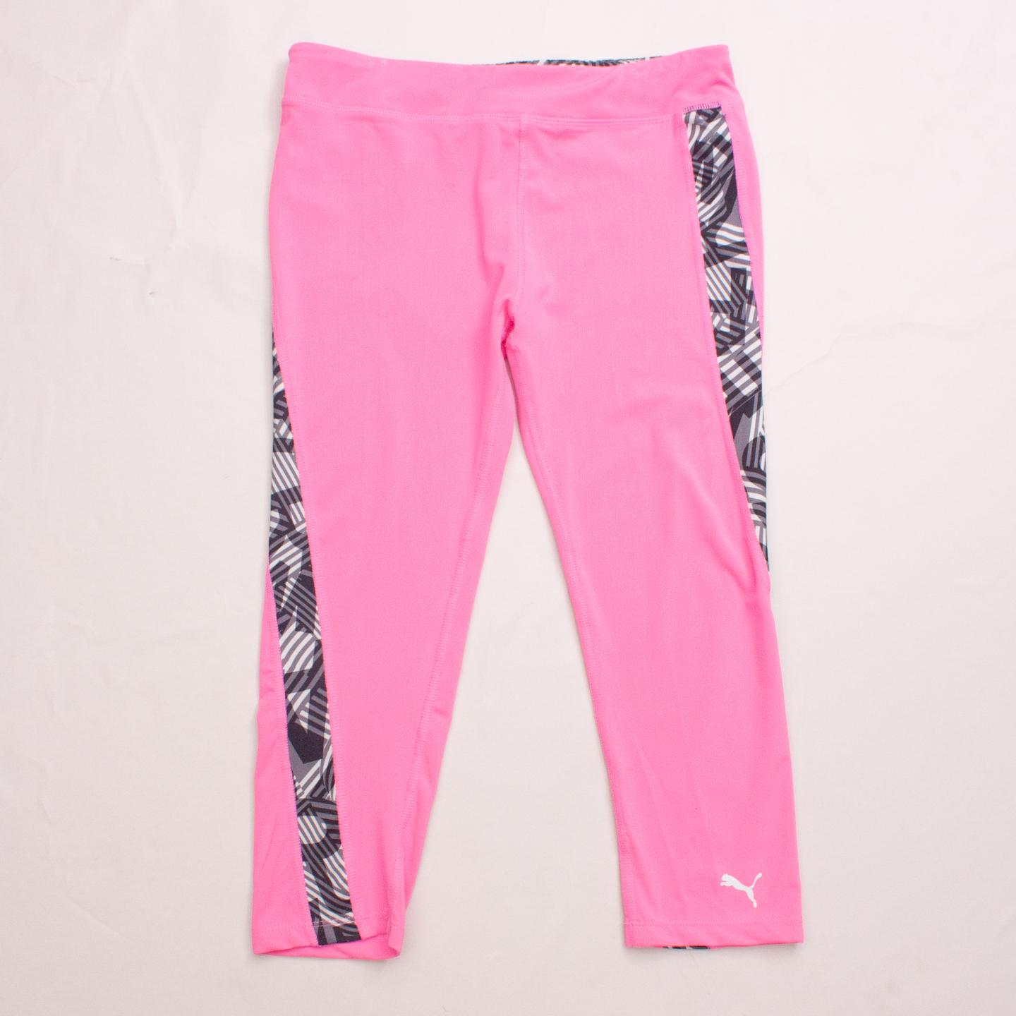Puma pink 3/4 length sports leggings with grey and black pattern down the sides and elastic waistband