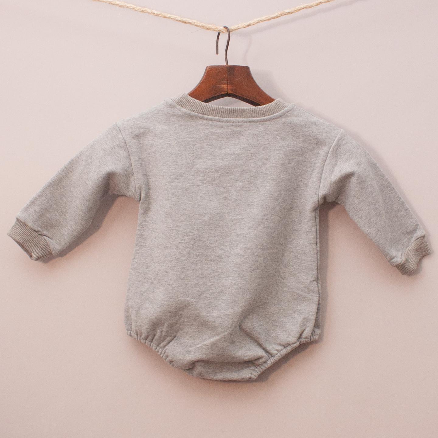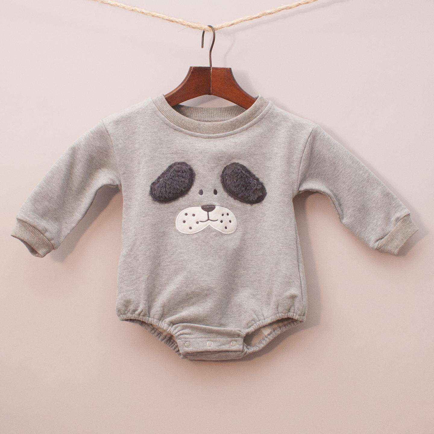 Grey long sleeve romper with textured puppy dog face on the front and snap button closures