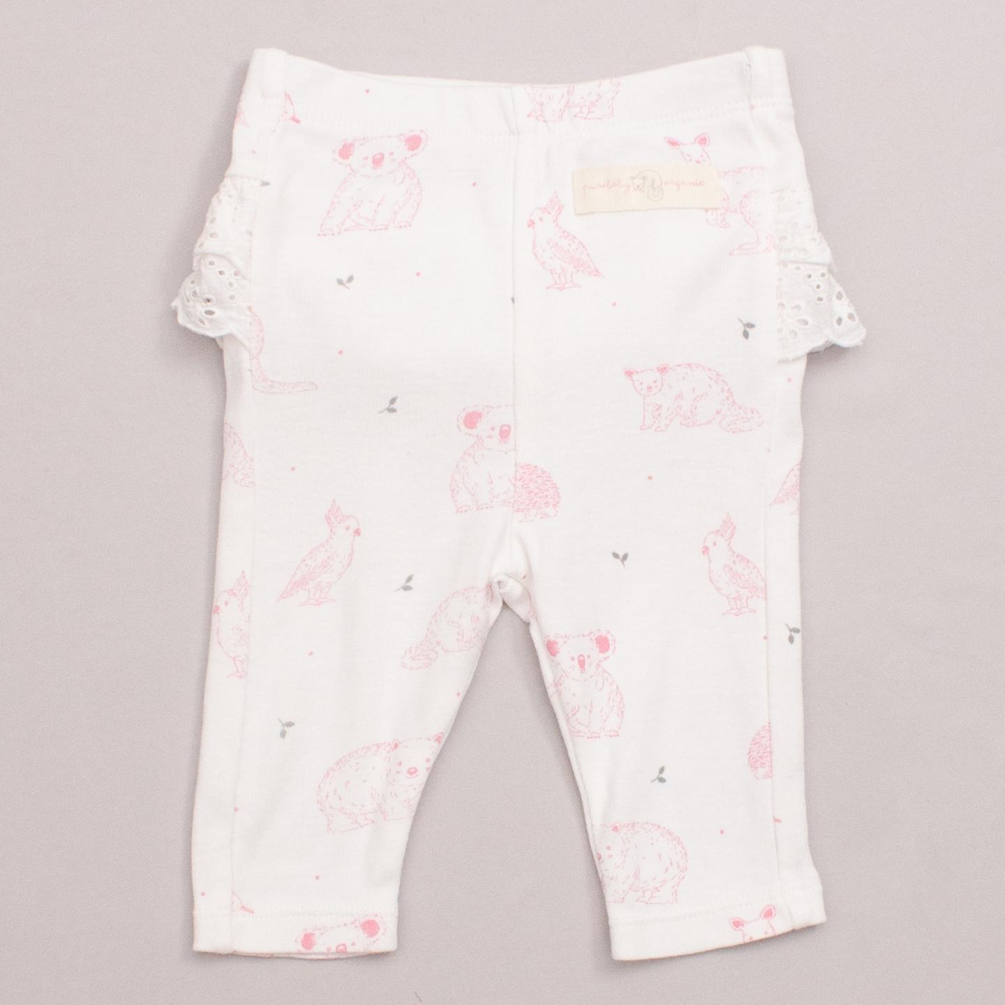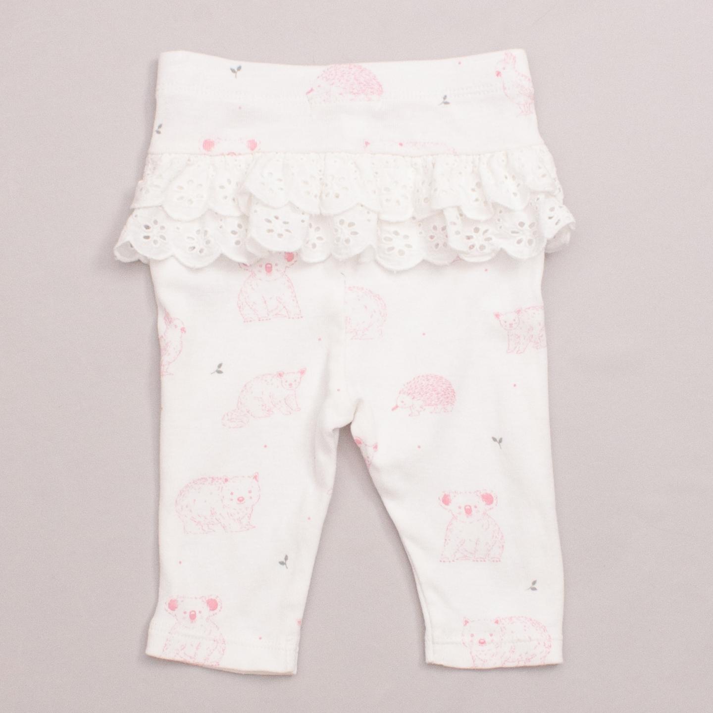 Purebaby white pants with soft pink Australian animals printed throughout, broderie anglaise ruffle on the bottom and elastic waistband