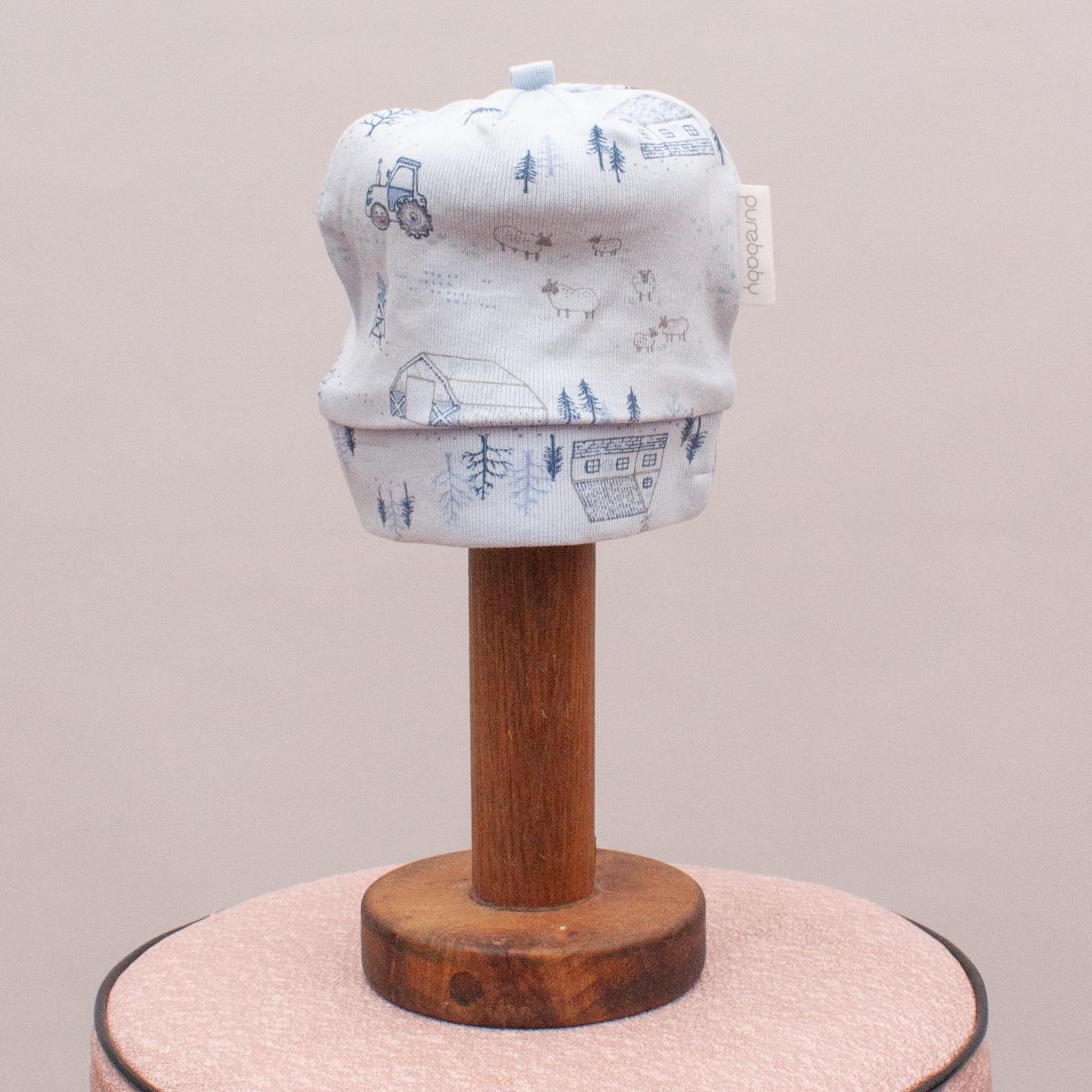 Purebaby pastel blue beanie with farm pattern throughout - Size Small