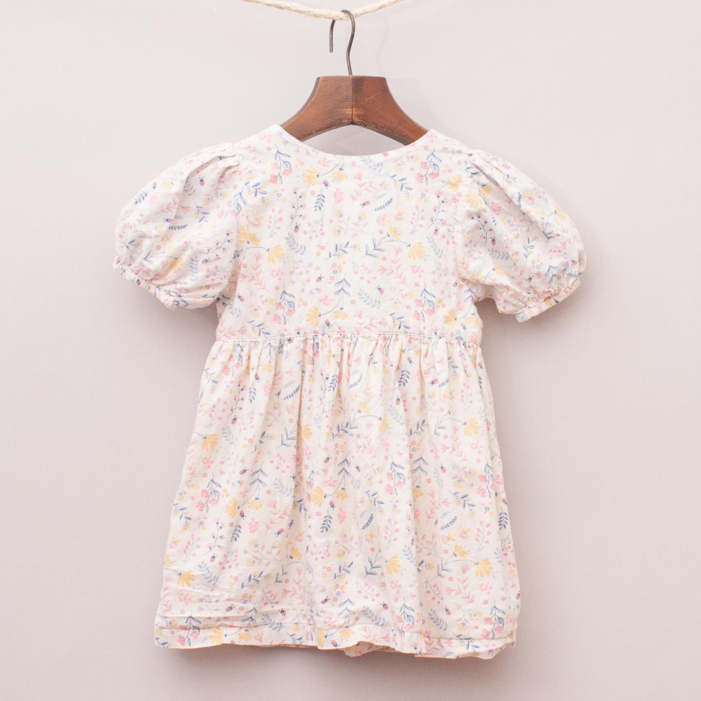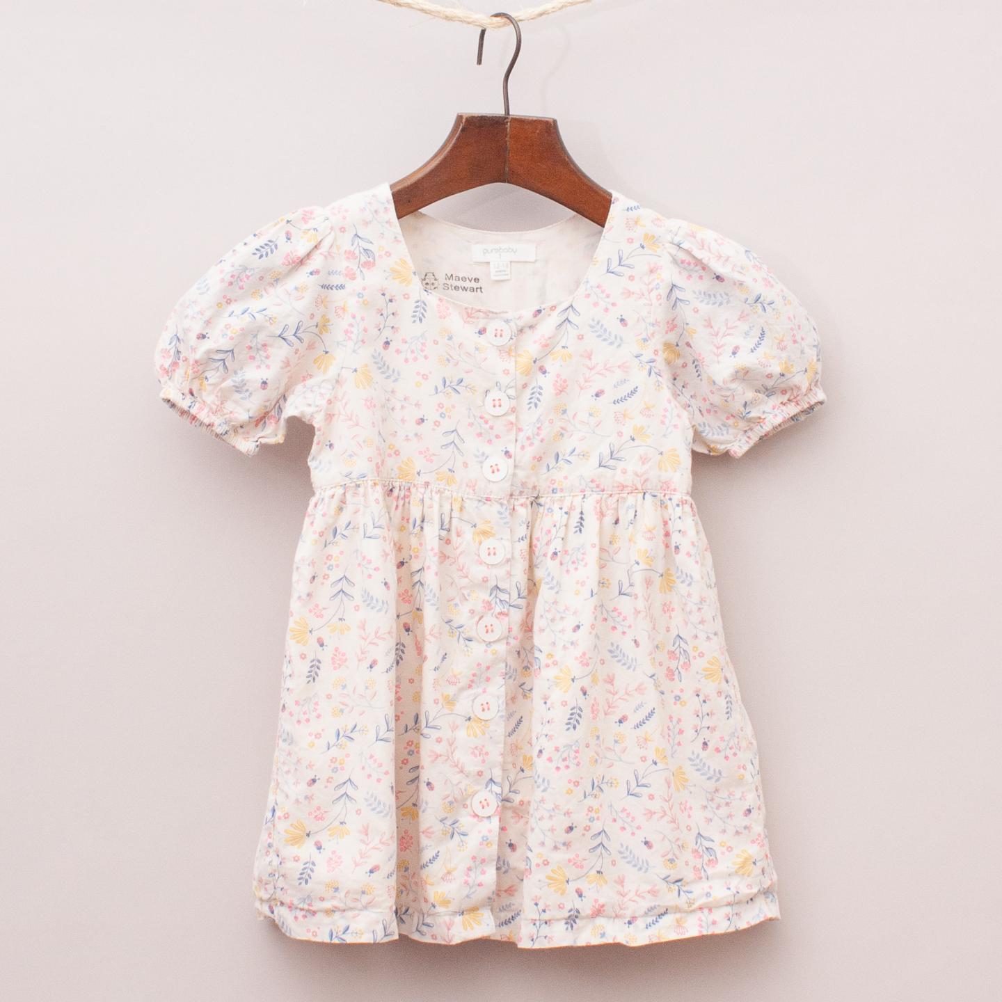 Purebaby cream and floral patterned dress with puffed sleeves, gathered skirt, fully lined and full button down front *100% Cotton