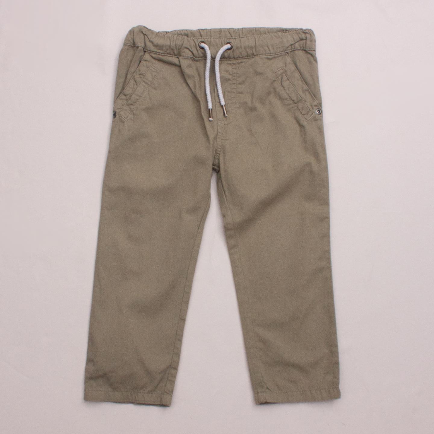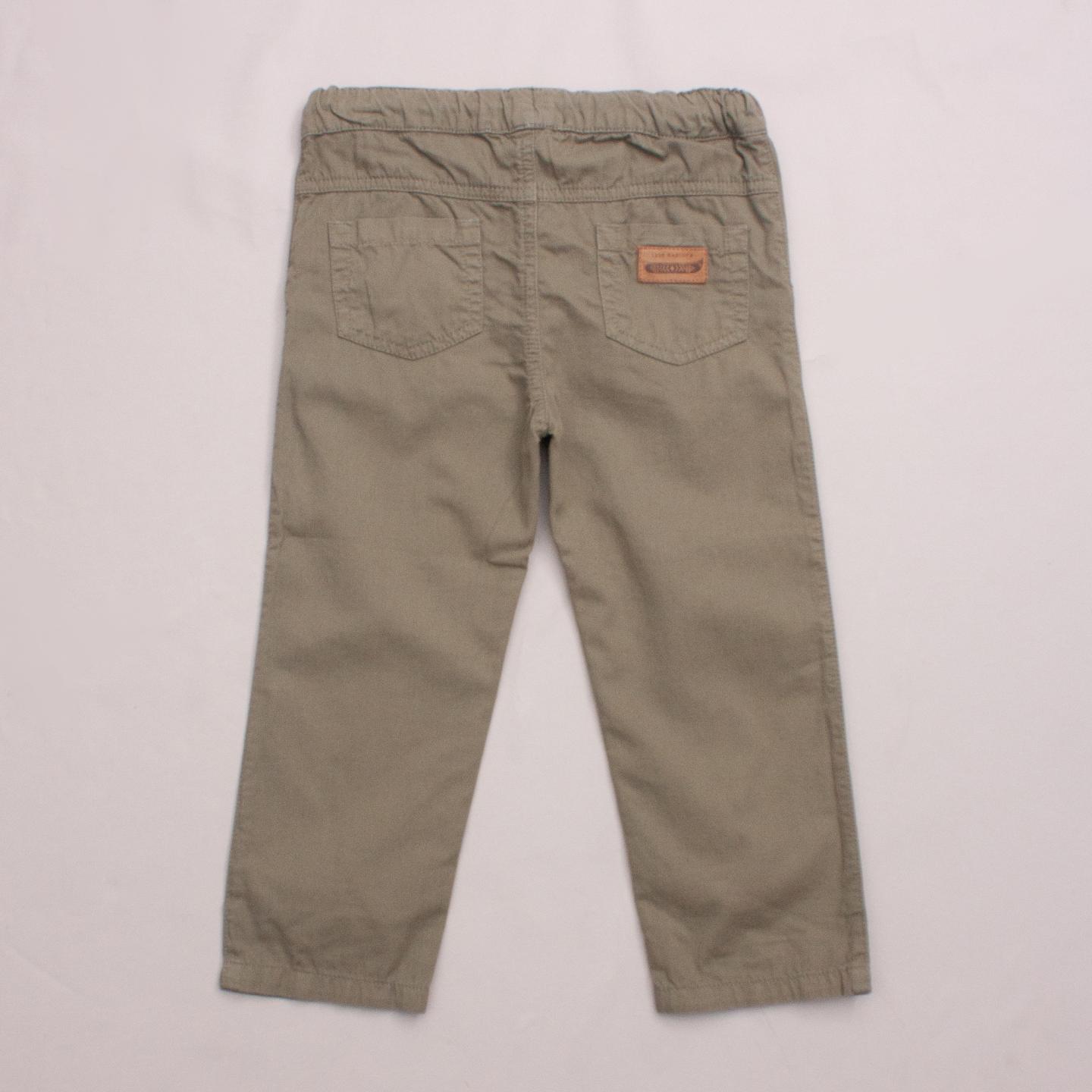 Purebaby khaki green pants with front and back pockets and drawstring tie *100% Organic Cotton