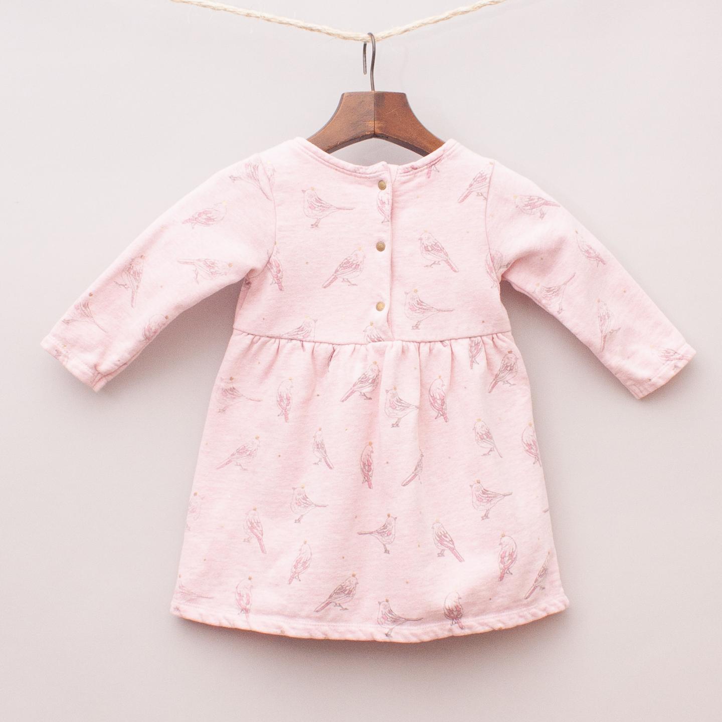 Purebaby pastel pink and bird patterned long sleeve dress with two front pockets, gathered skirt and button down back *100% Organic Cotton