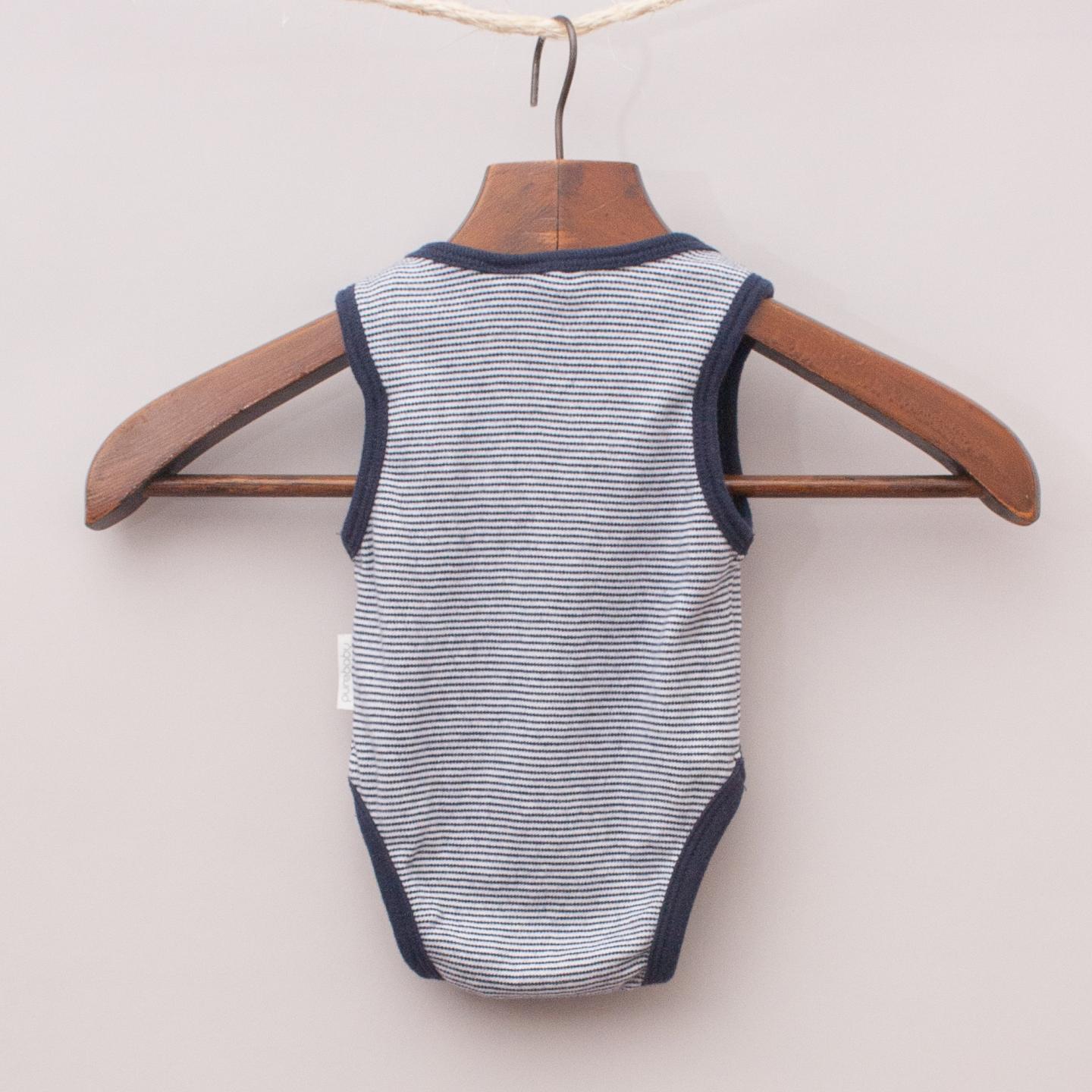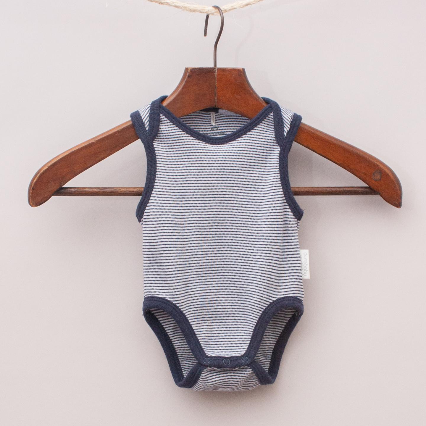 Purebaby blue and white striped sleeveless romper with navy blue trim and snap button closures *100% Organic Cotton