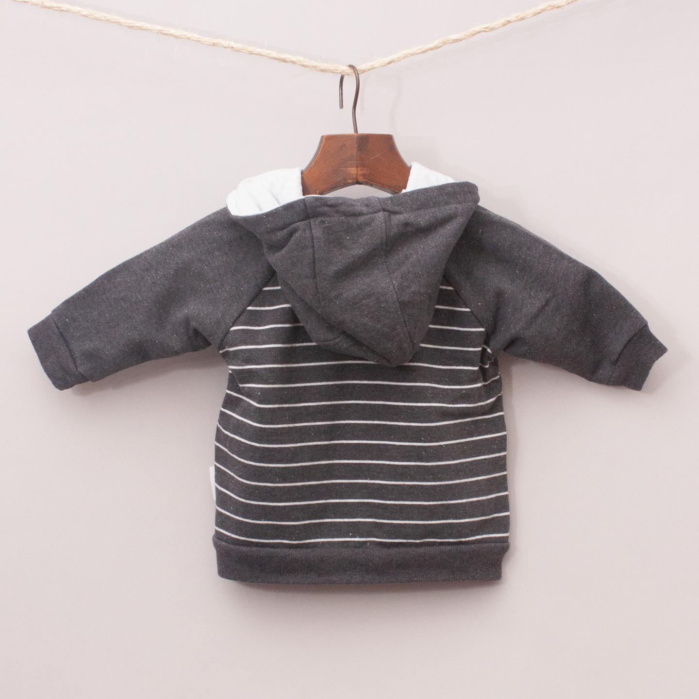 Purebaby charcoal and white striped jumper with hood, two front pockets and zip up front *100% Organic Cotton