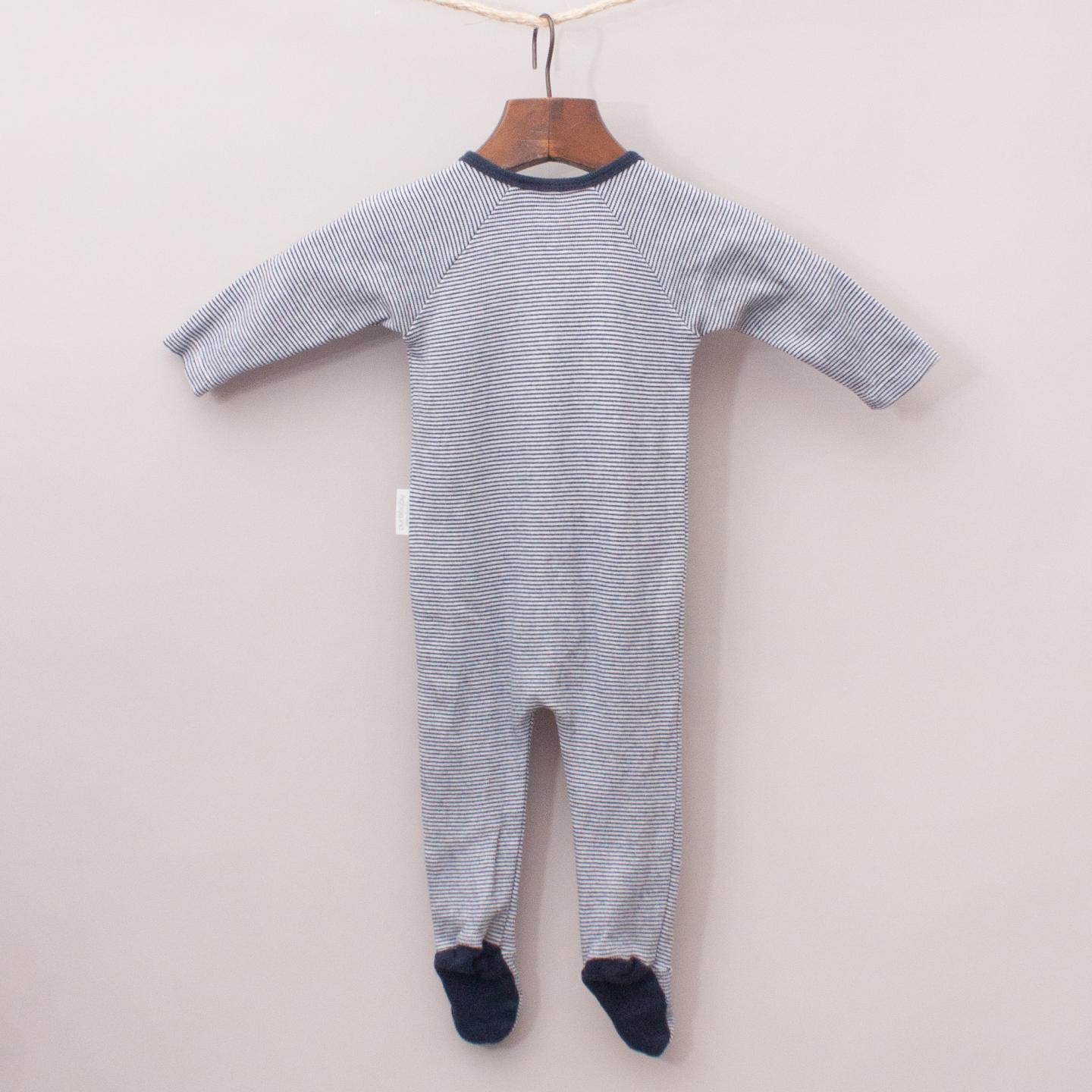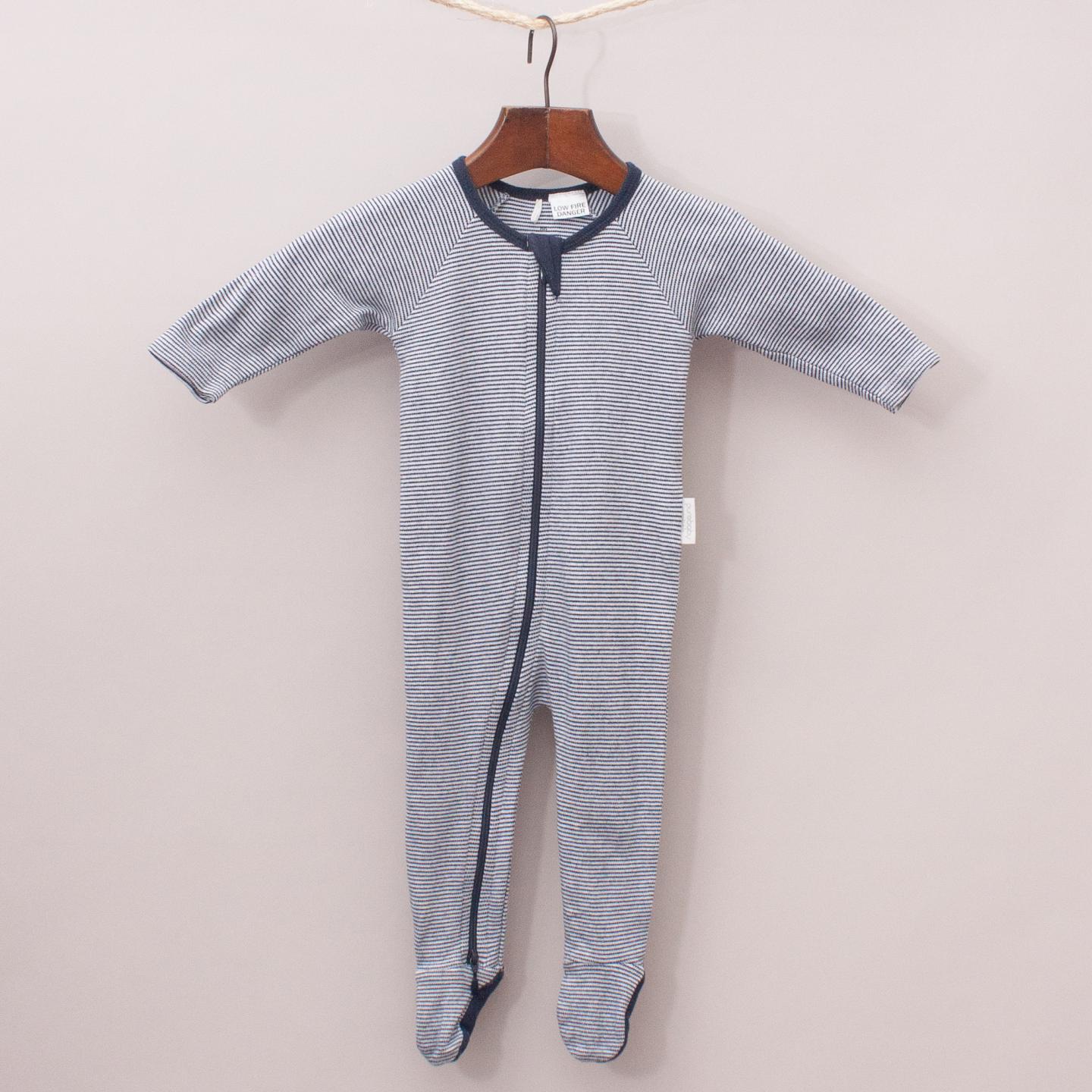 Purebaby blue and grey striped, long sleeve romper with built in booties and zip up front *100% Organic Cotton