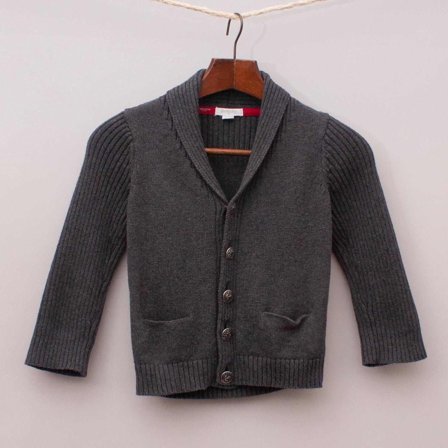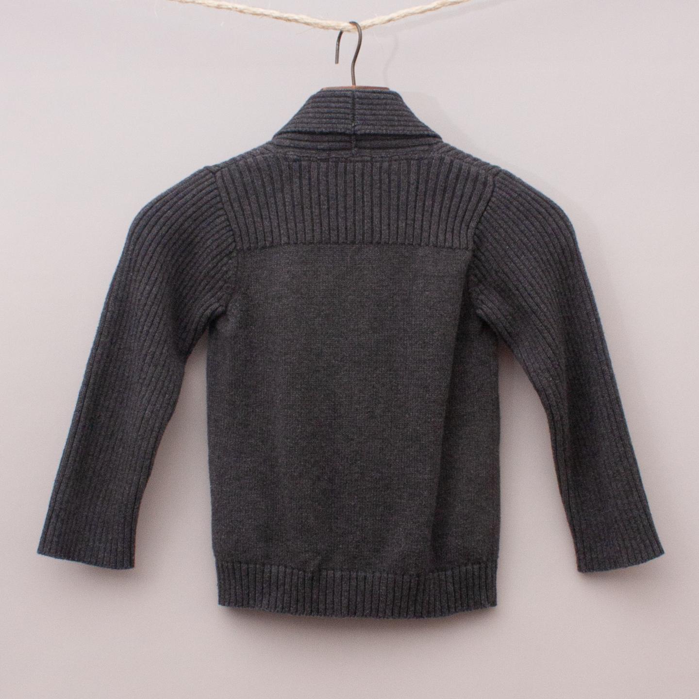 Purebaby charcoal cardigan with ribbed sleeves and neckline, two pockets and full button down front