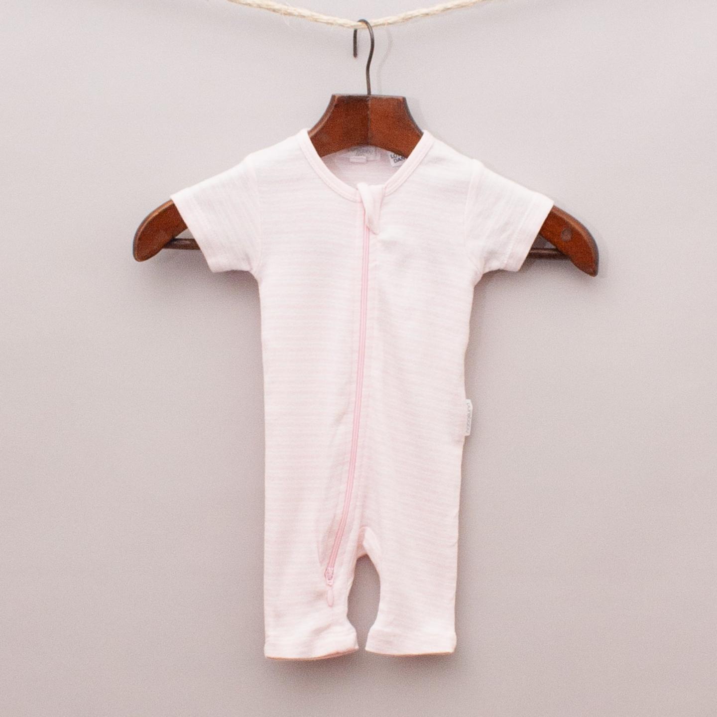 Purebaby pink and white striped romper with short sleeves and full zip up front closure