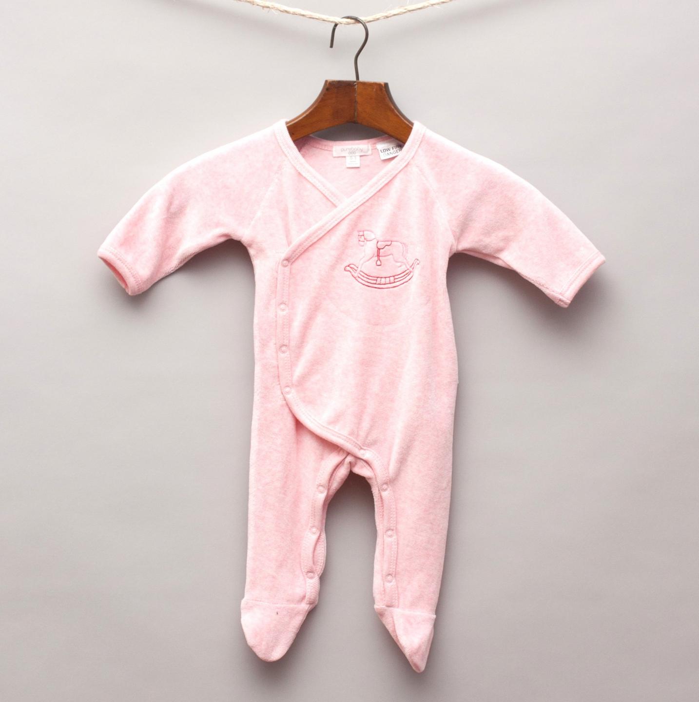 Purebaby pink velour romper with rocking horse embroidered on front and cross body button up closure
