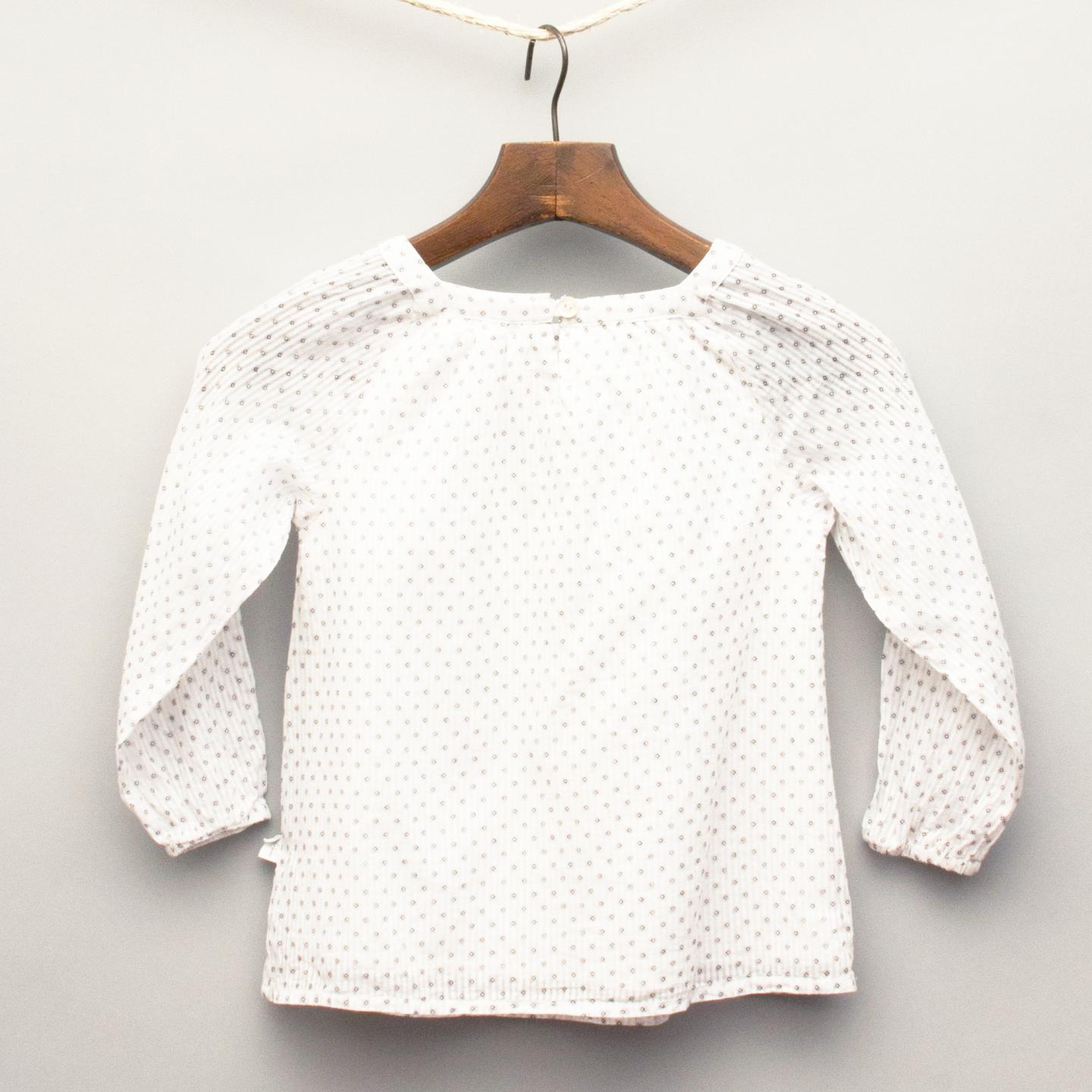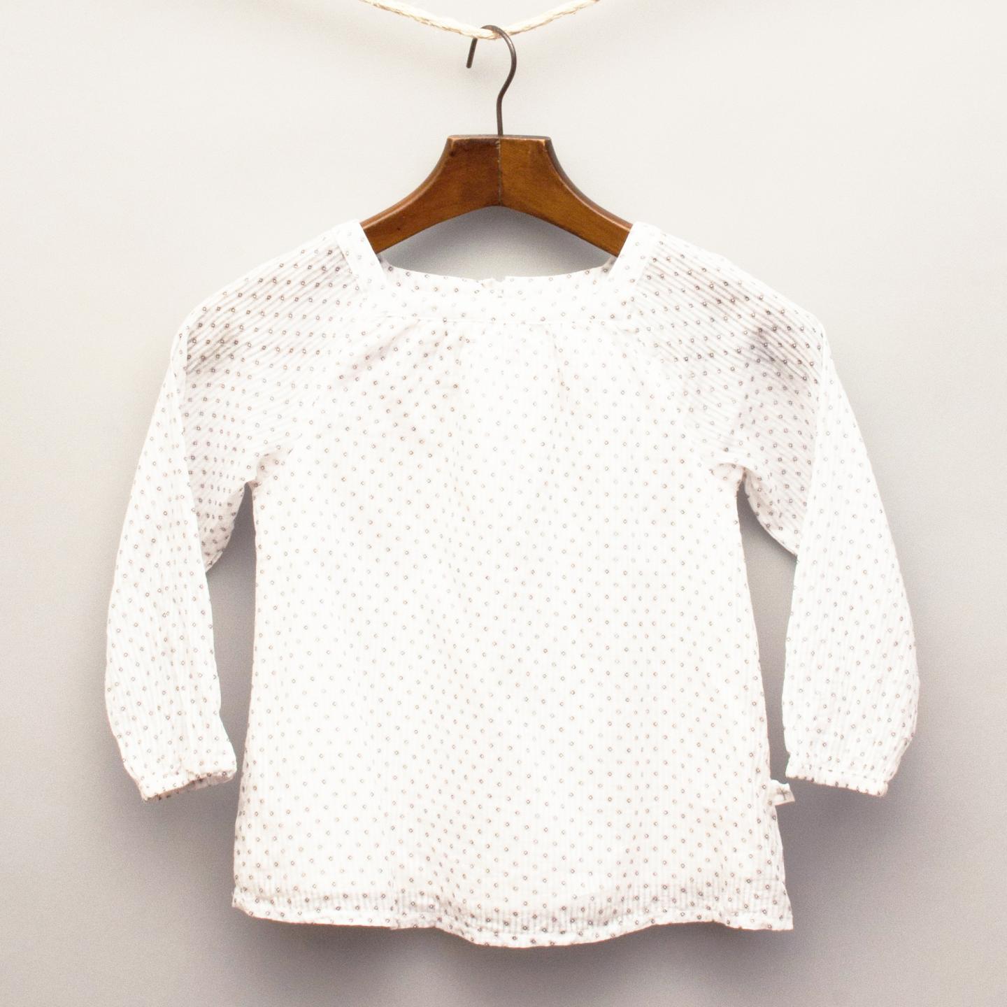 Purebaby white muslin feel long sleeve top with sheer stripe and repeat print pattern, elastic cuffs with single button fastening at back