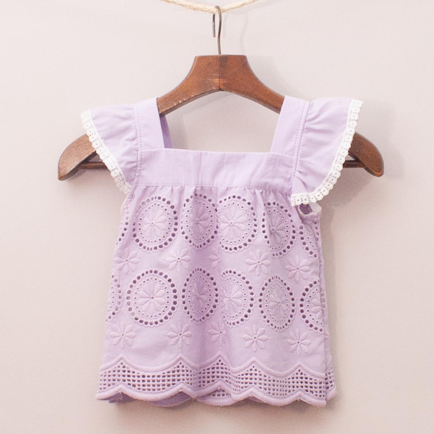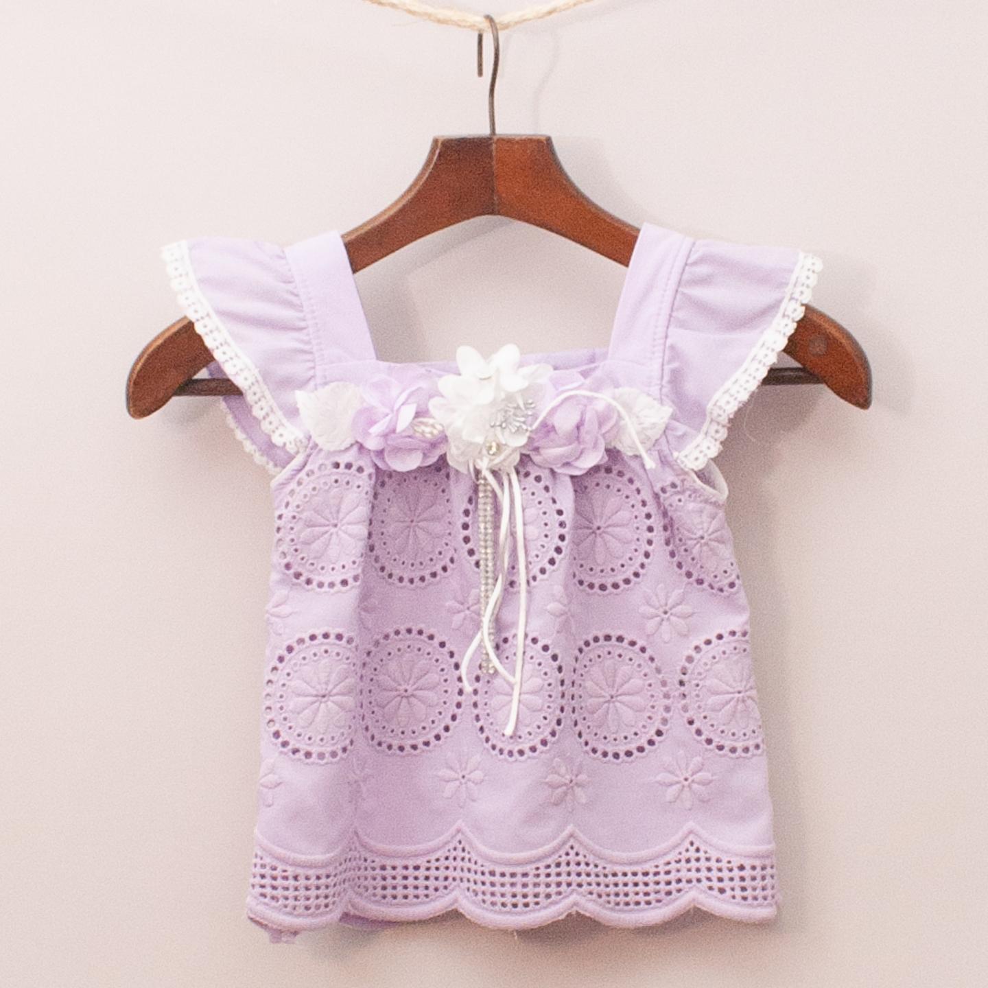 Purple broderie anglaise top with ruffle sleeves, white trim and floral and diamante details *100% Cotton