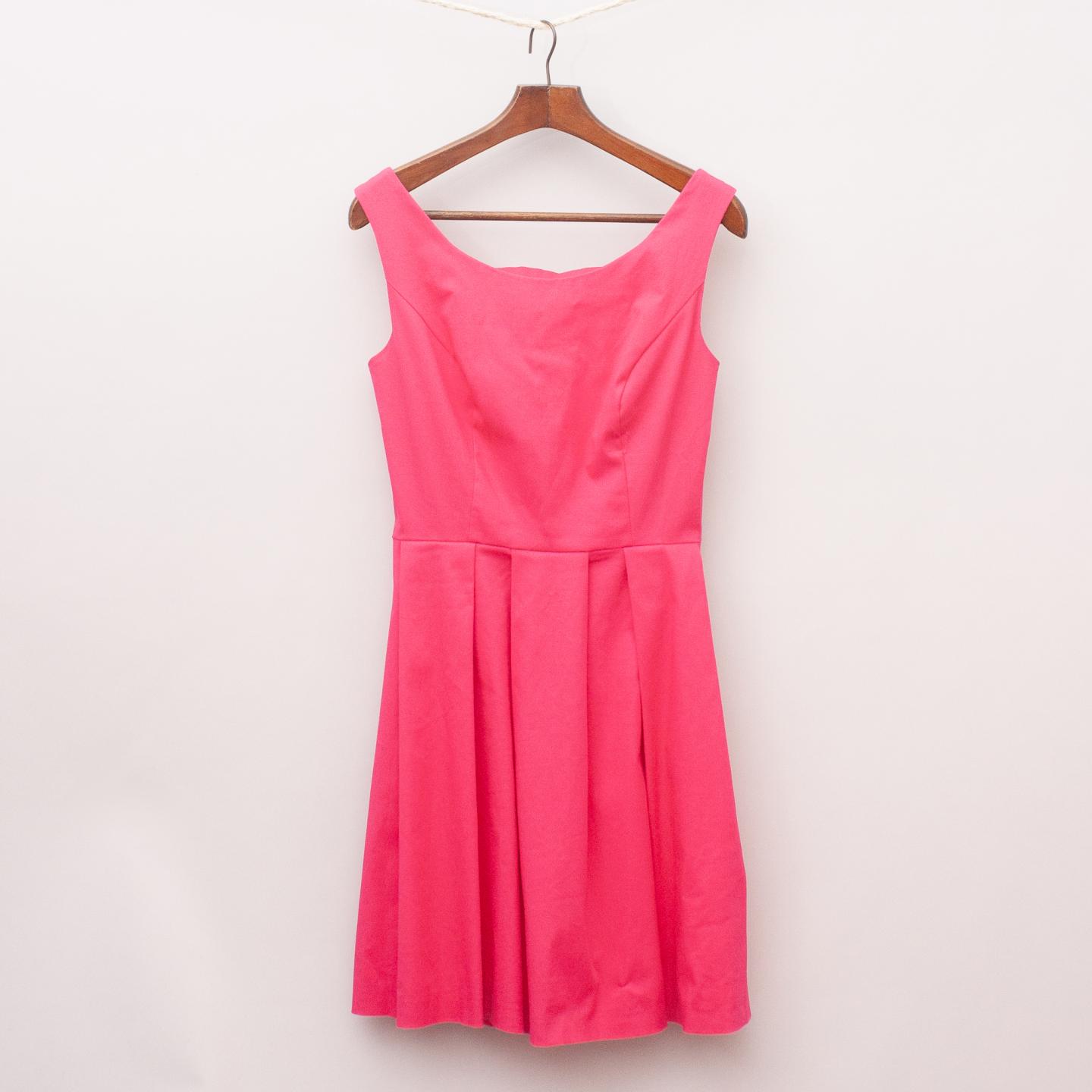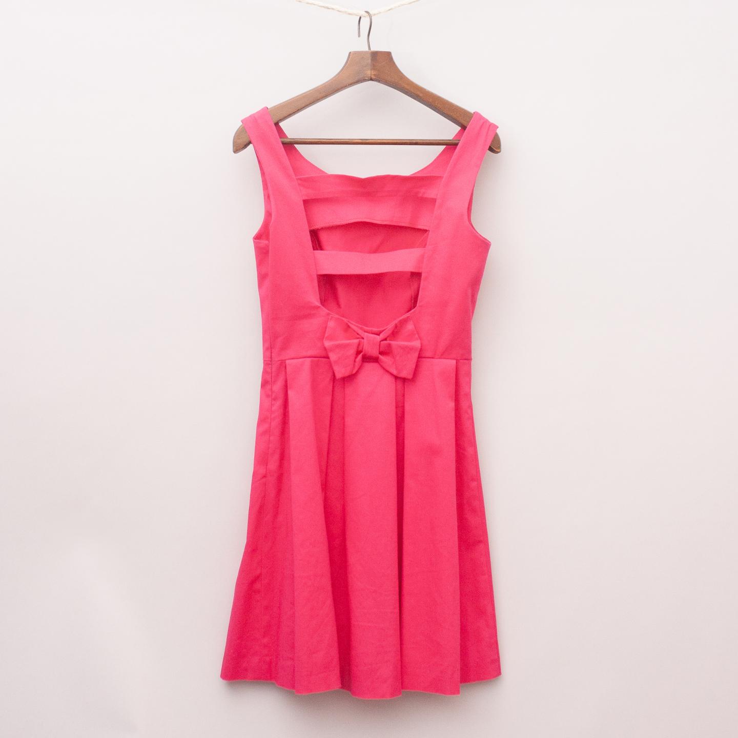 Queen of Hearts hot pink dress with pleated skirt, fitted bodice, open and panelled back with bow detail and side zip fastening *97% Cotton, 3% Elastane