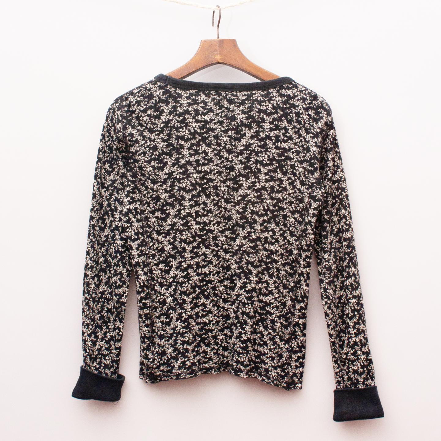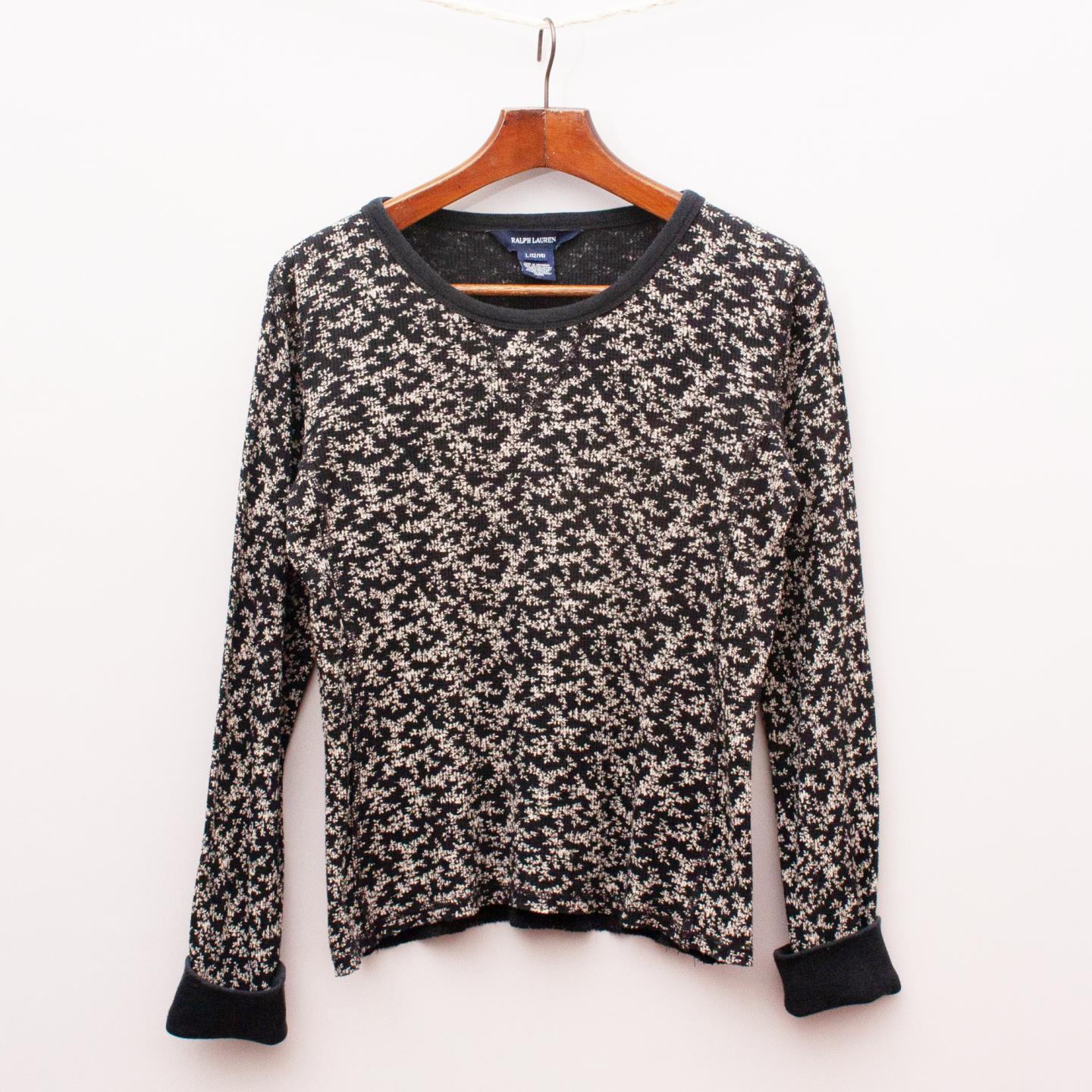 Ralph Lauren black and cream floral patterned ribbed long sleeve top with rolled cuffs and wide neckline
