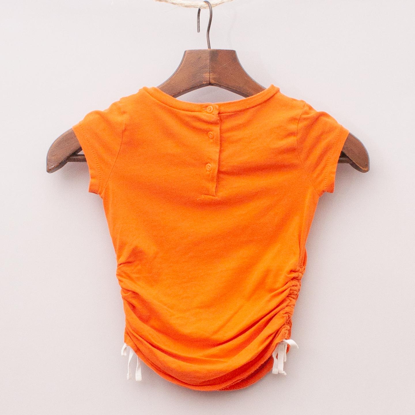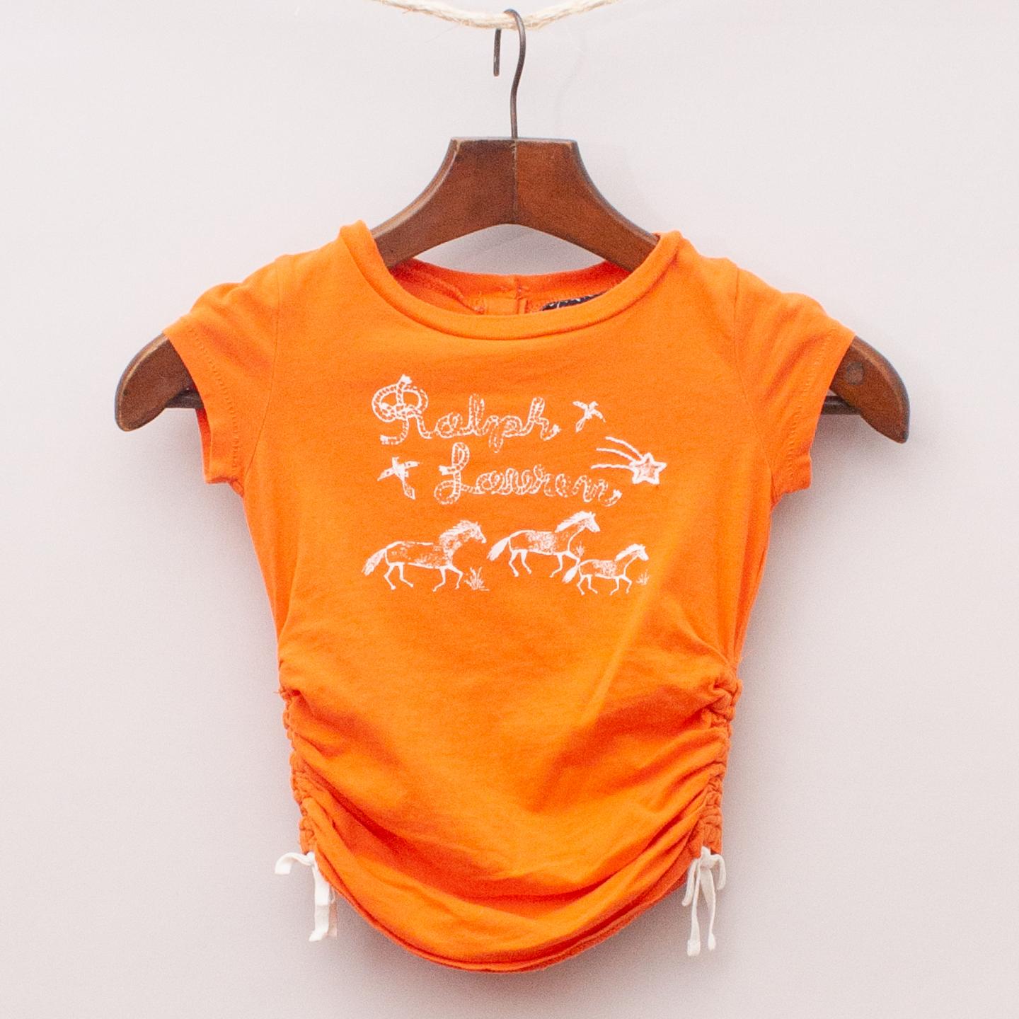 Ralph Lauren orange t-shirt with horses printed on the front, tied ruched detailing down both sides and button back closure *100% Cotton