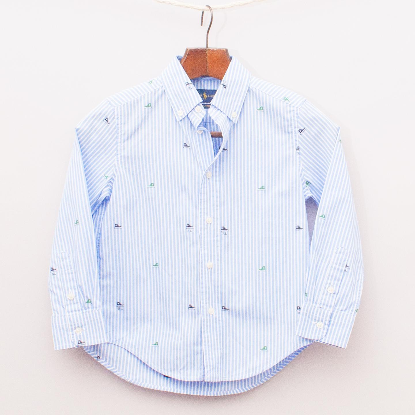 Ralph Lauren blue and white striped shirt with sneaker pattern throughout and full button down front