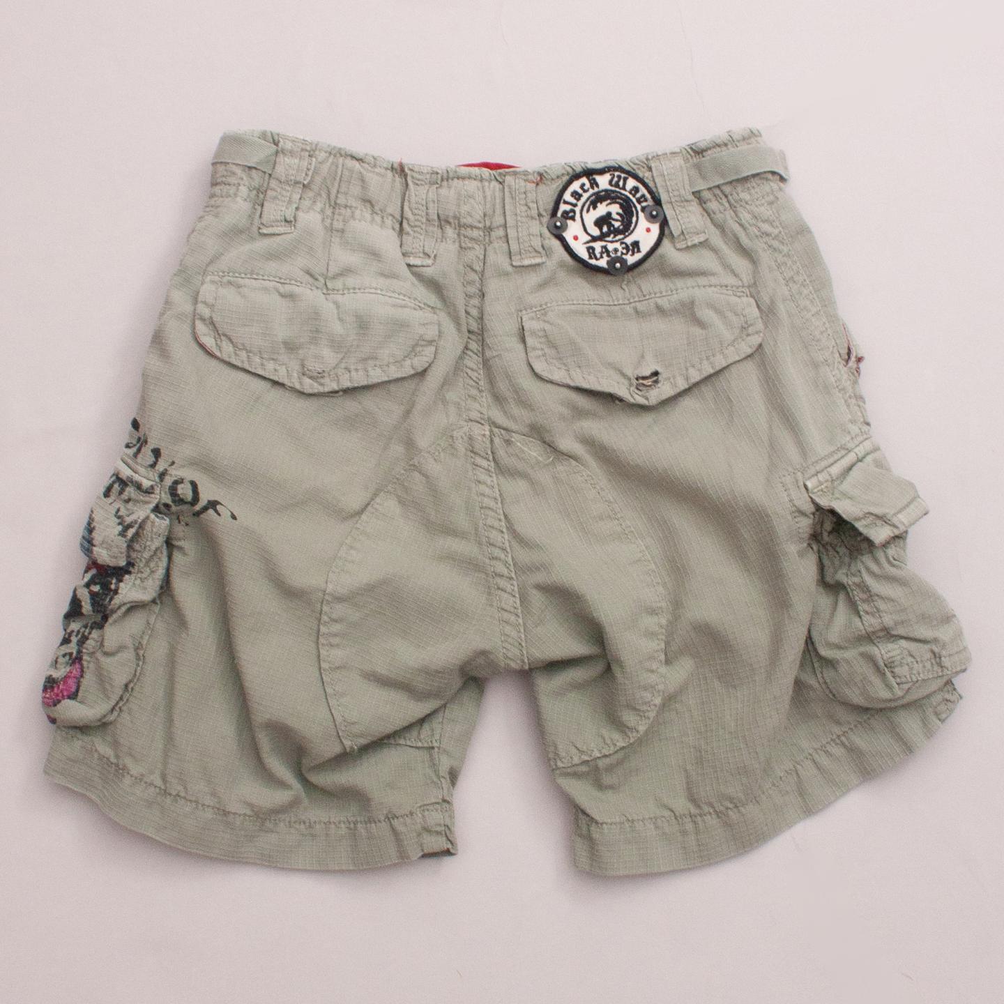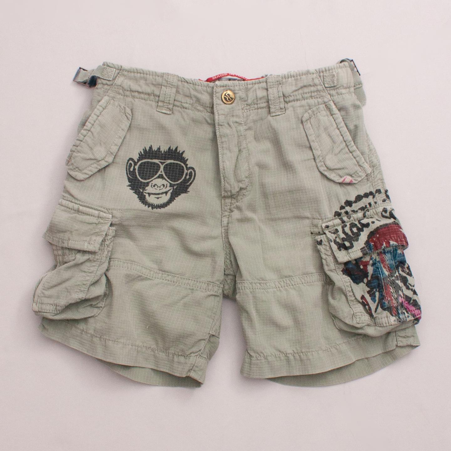 Rare light green cargo shorts with multiple pockets, printed images throughout, belt loops and button/zip fastening *100% Cotton