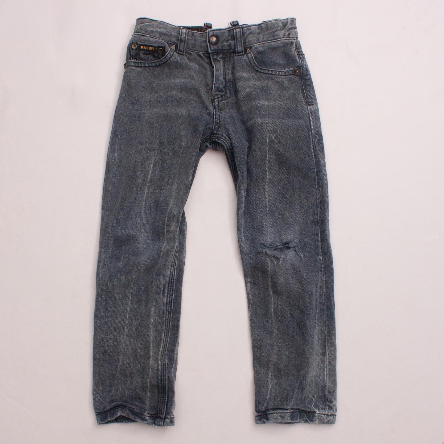 Rare charcoal distressed denim jeans with front and back pockets, stud details, belt loops and button/zip fastening *100% Cotton
