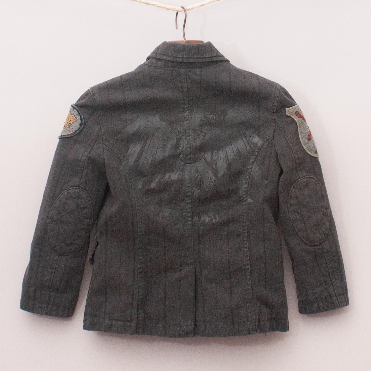 Rare charcoal pinstripe jacket with embroidered patches throughout, multiple pockets and full zip up front *60% Acetate, 33% Viscose, 7% Polyester
