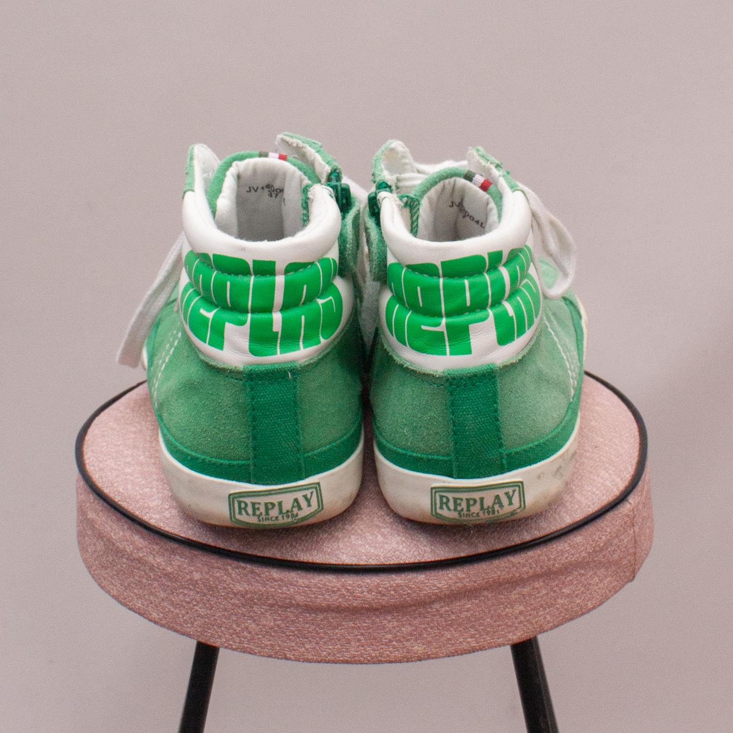 Replay green suede sneakers with side zip and velcro closure, white laces and sturdy rubber soles - Size EU 37 (Age 8 Approx.) *A few marks throughout, still plenty of life left - could use new laces