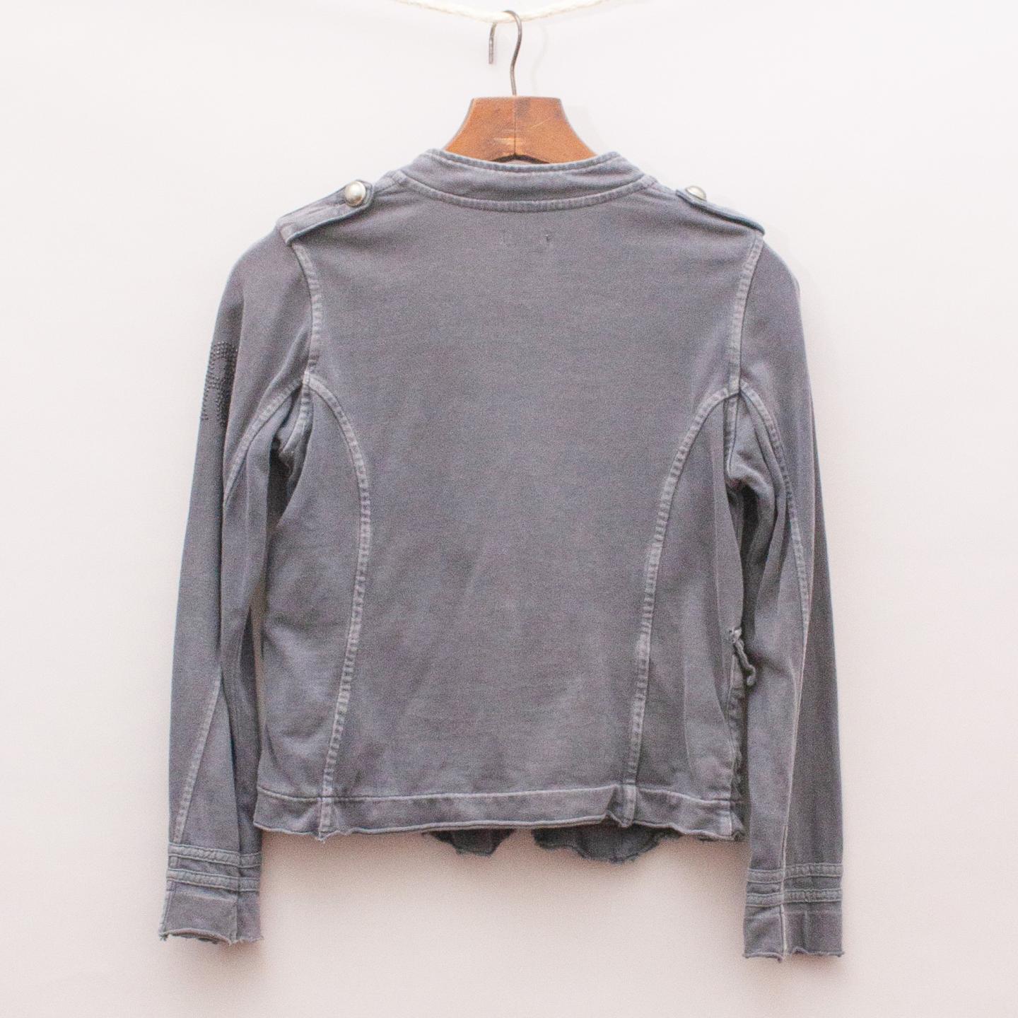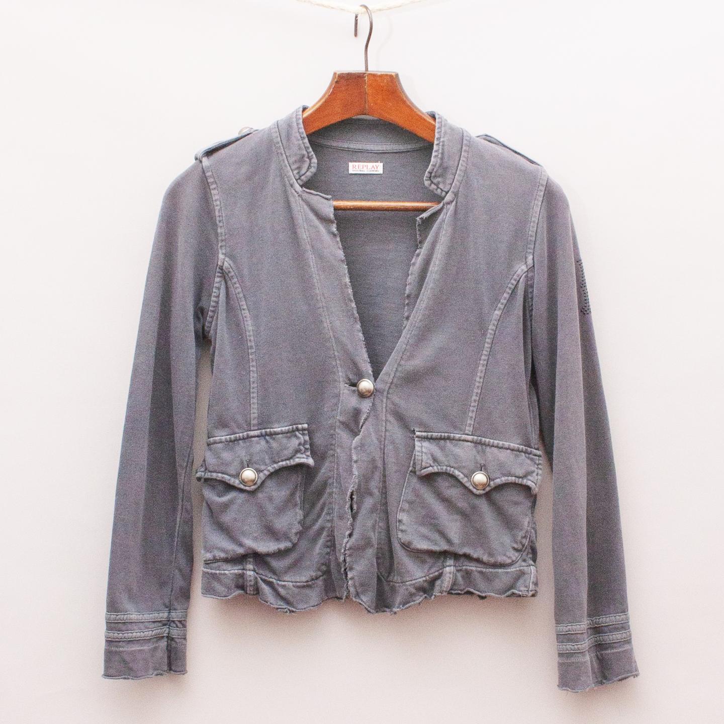 Replay charcoal grey soft style blazer with two front pockets, silver button details and raw edging detail