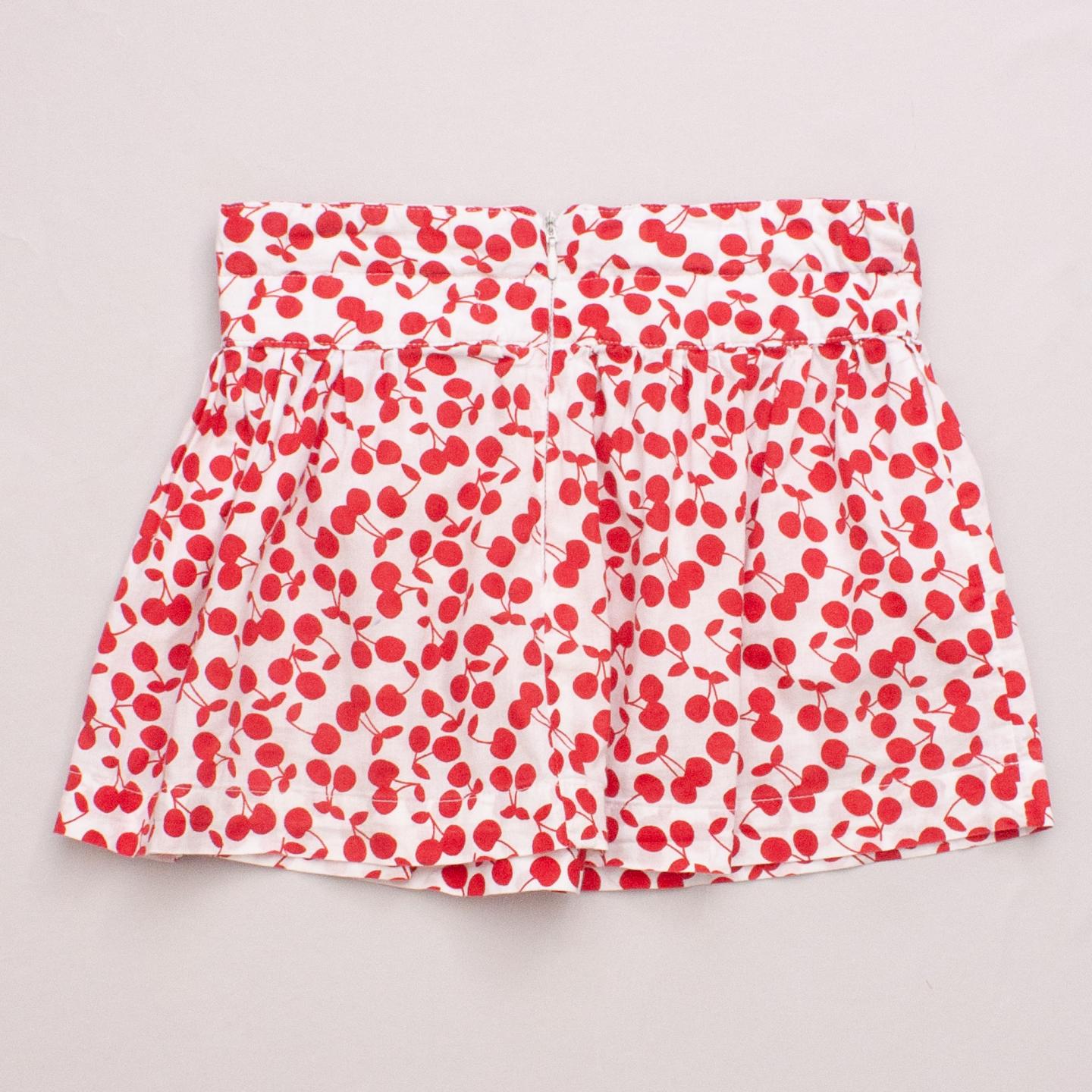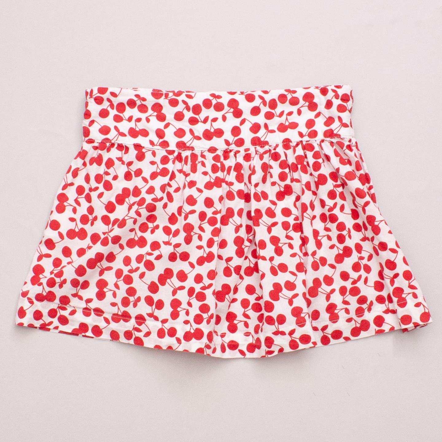 Rhubarb white skirt with red cherry pattern throughout, gathered skirt, wide waistband and zip back closure *A couple of very small pen marks, not visible when worn