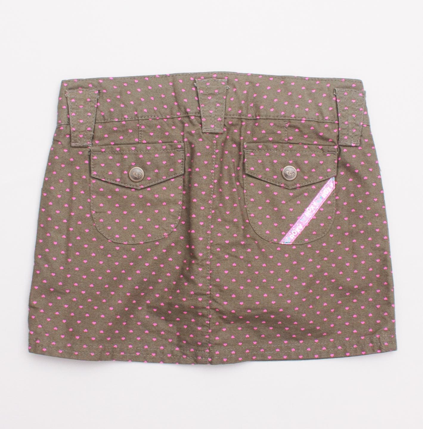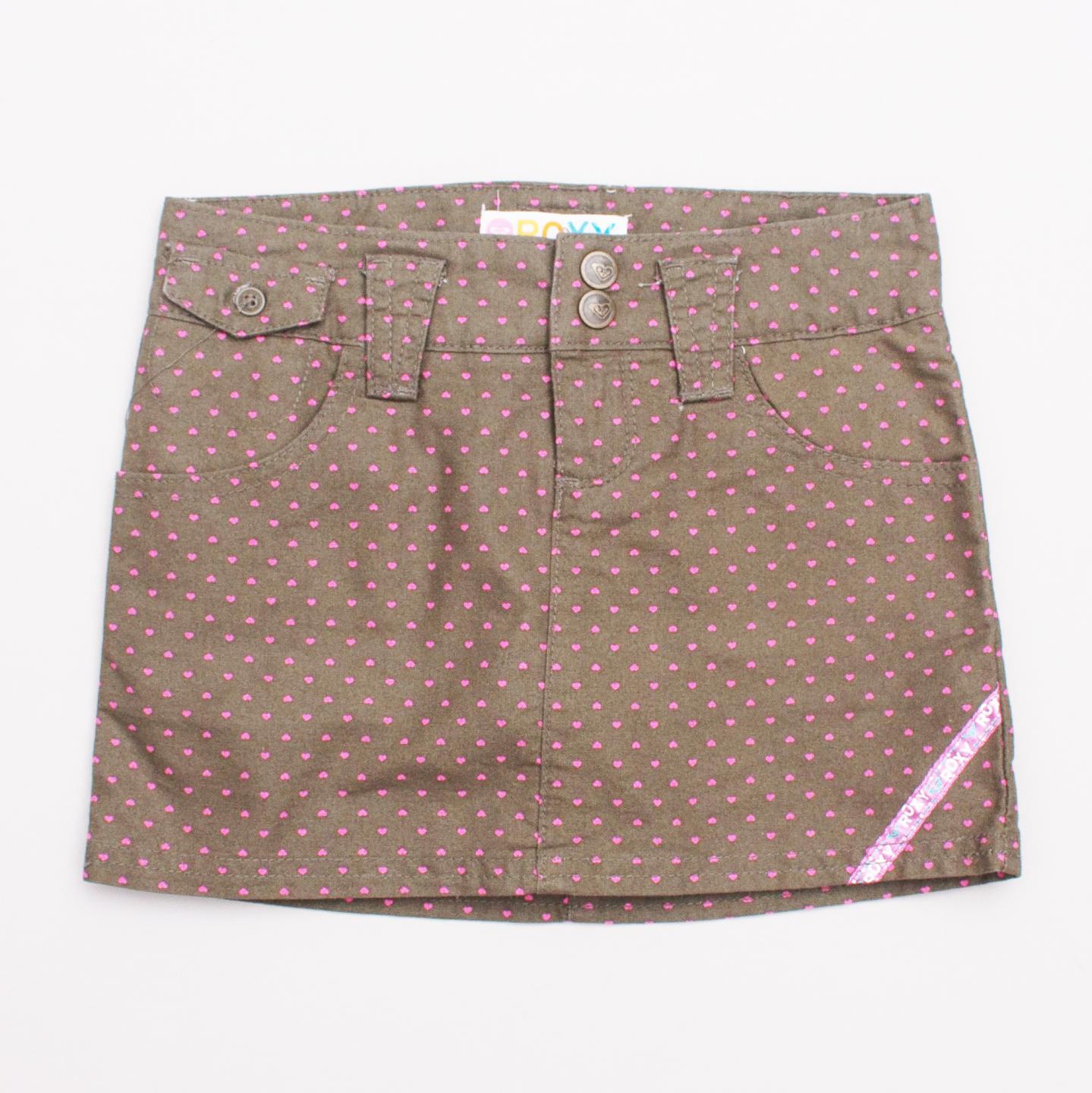 Roxy khaki green fitted skirt with pink heart print throughout, front and back pockets, belt loops and button/zip fastening