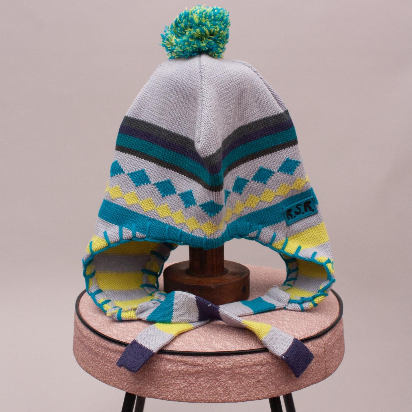 Run Scotty Run grey, teal and yellow patterned knit beanie with large pom pom on top - Size S