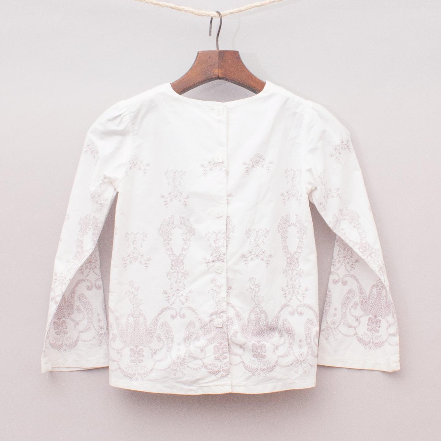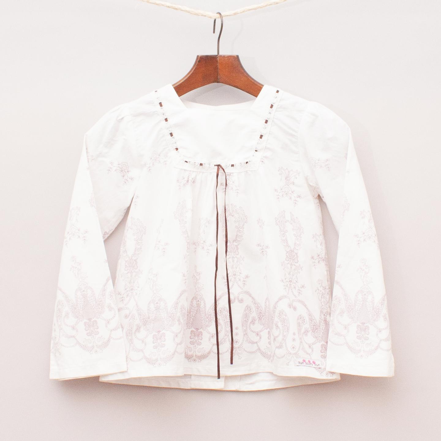 Run Scotty Run white paisley patterned shirt with lace and ribbon neckline, flared sleeves and button down back