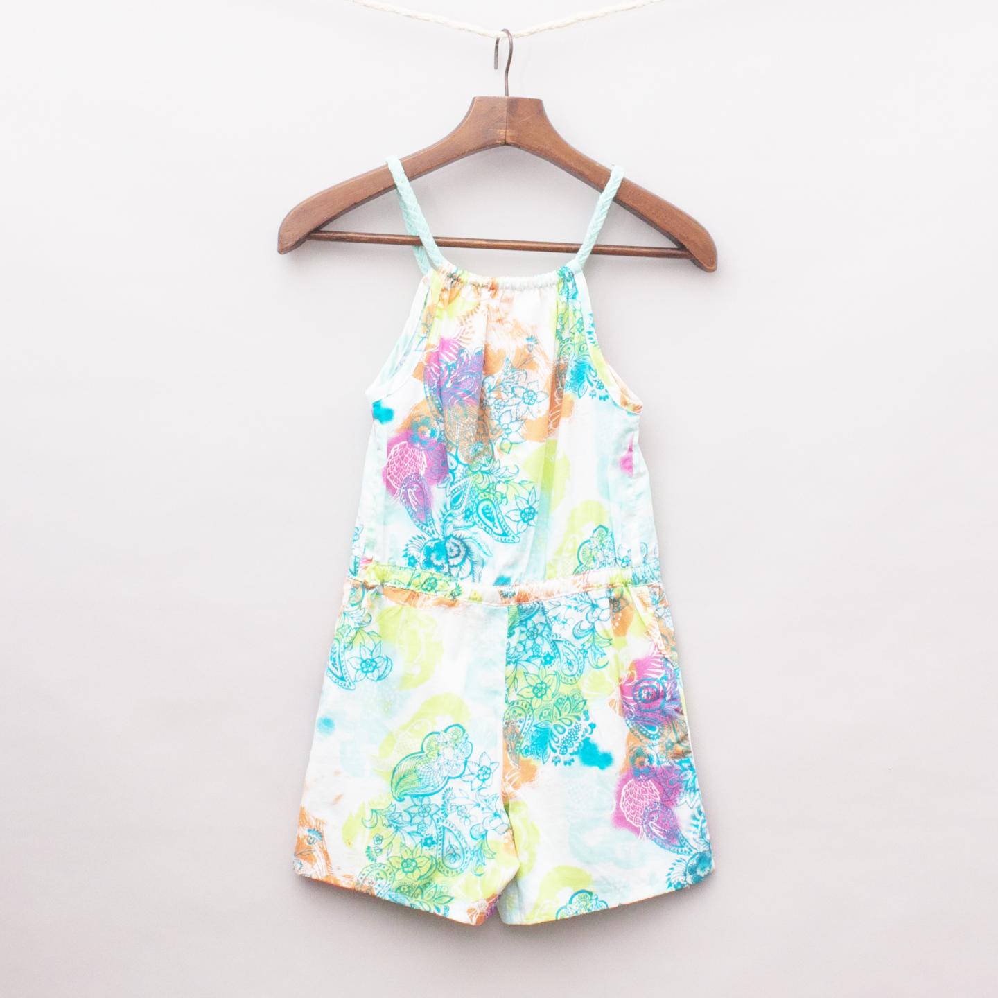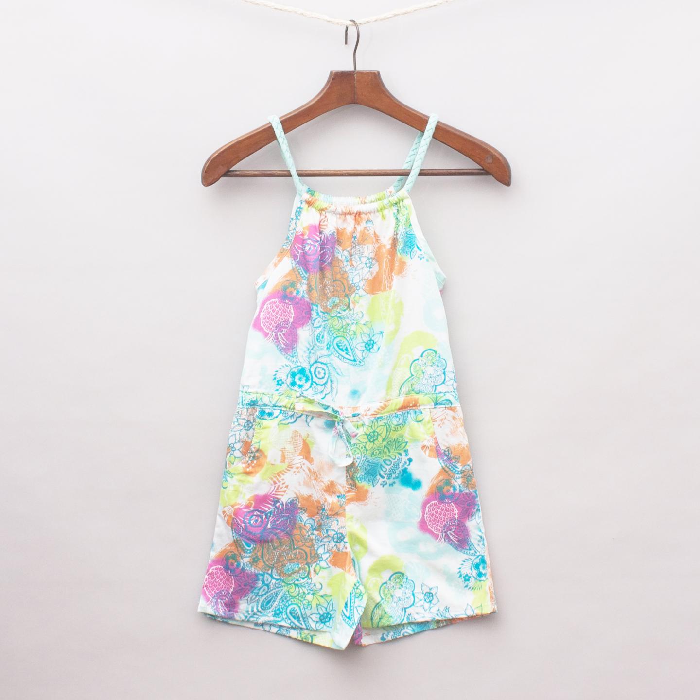 Run Scotty Run brightly coloured patterned playsuit with plaited straps, drawstring waistband, two front pockets and gathered neckline
