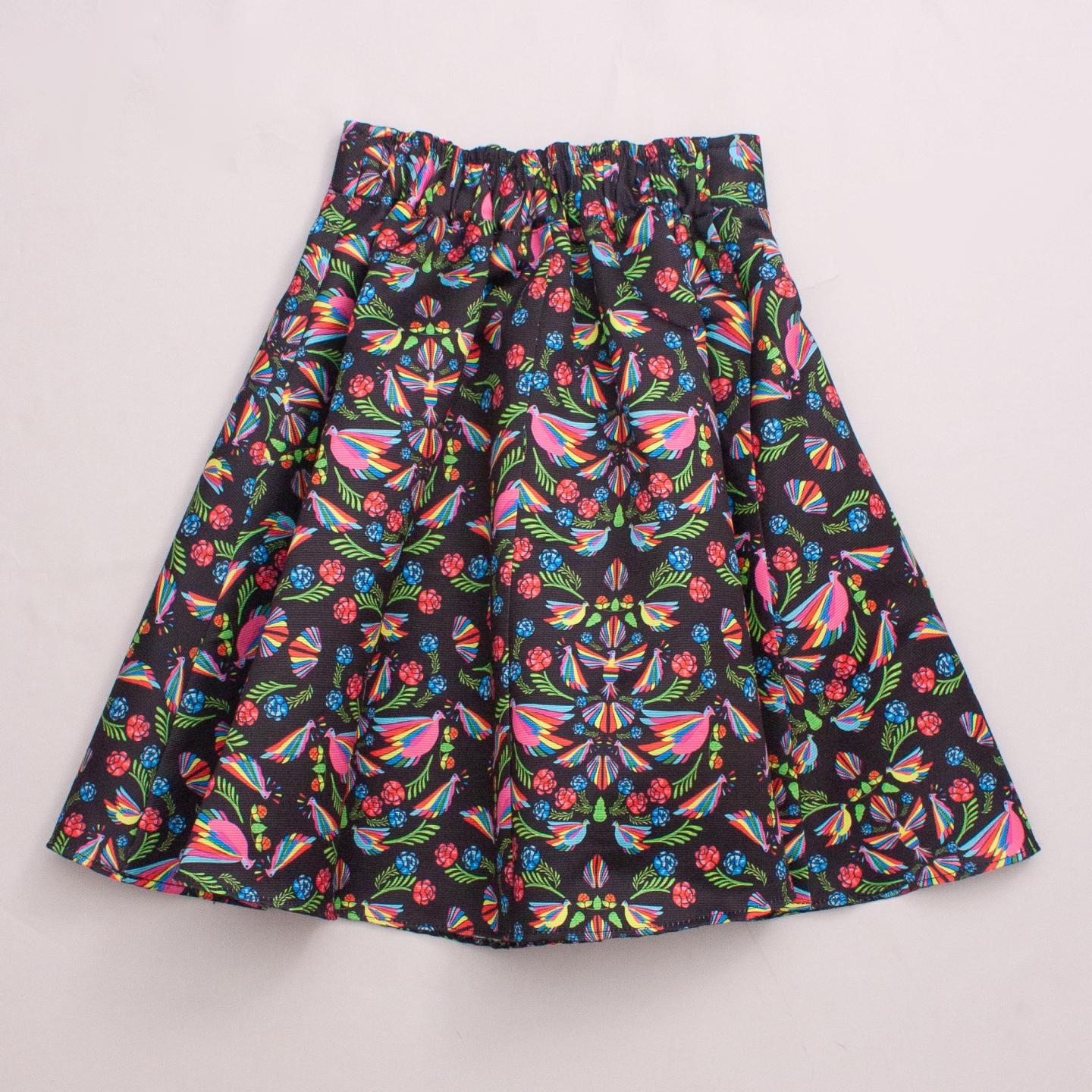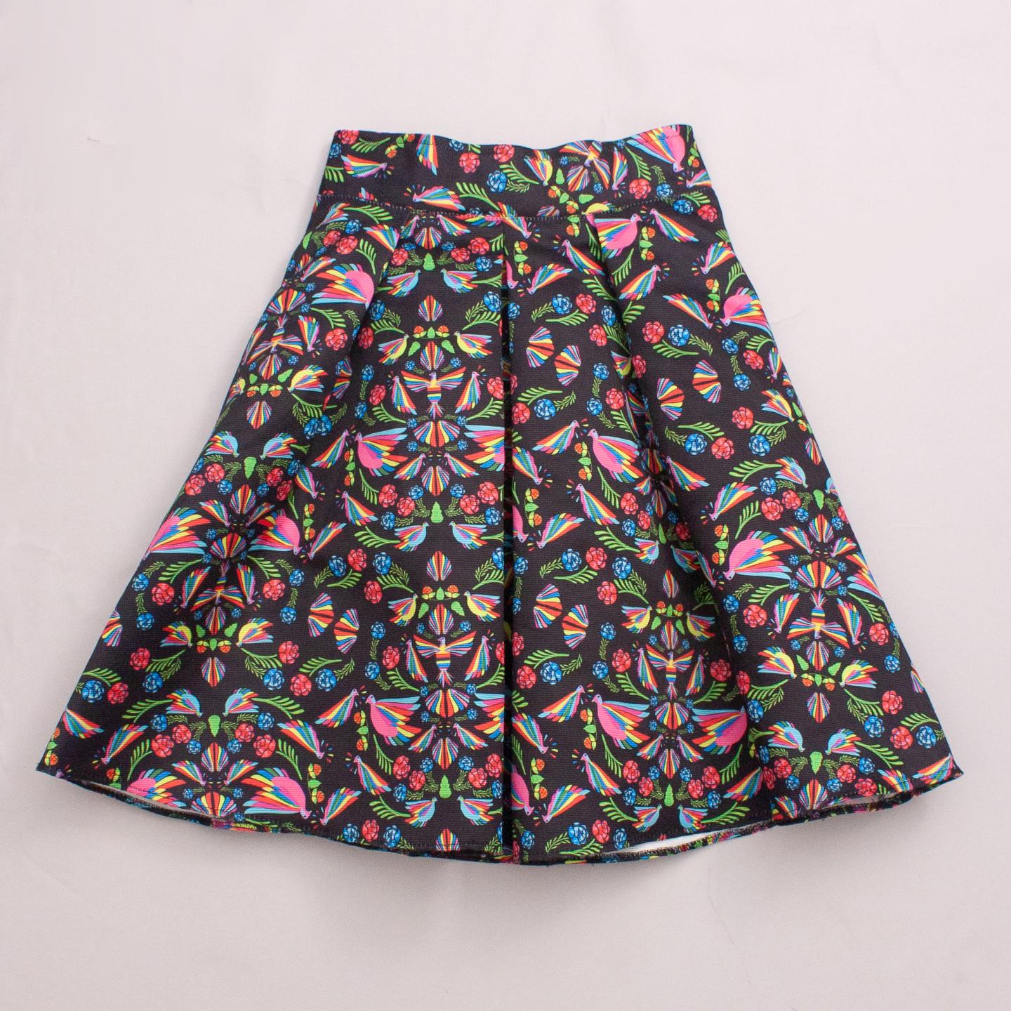 San Andres black and brightly coloured patterned skirt with pleating throughout and elastic waistband