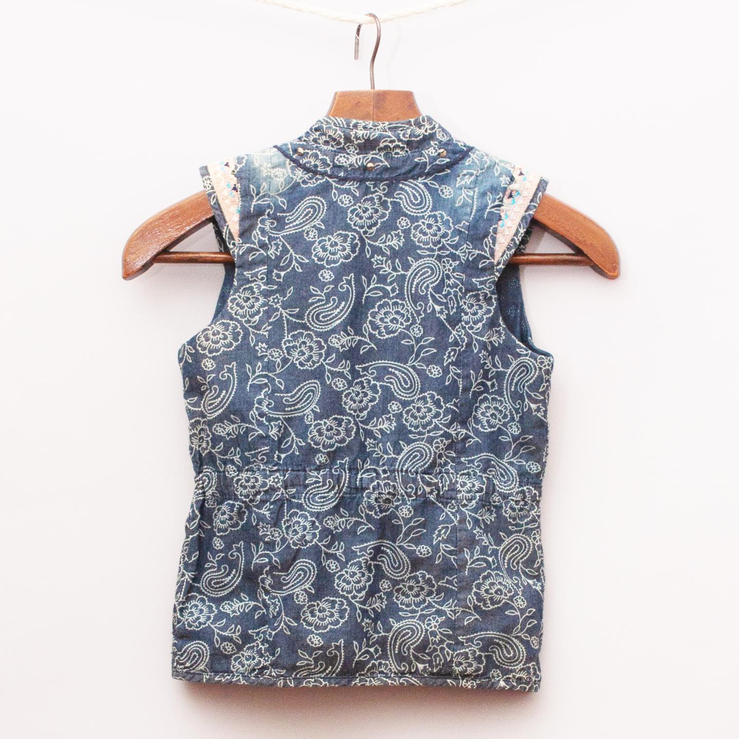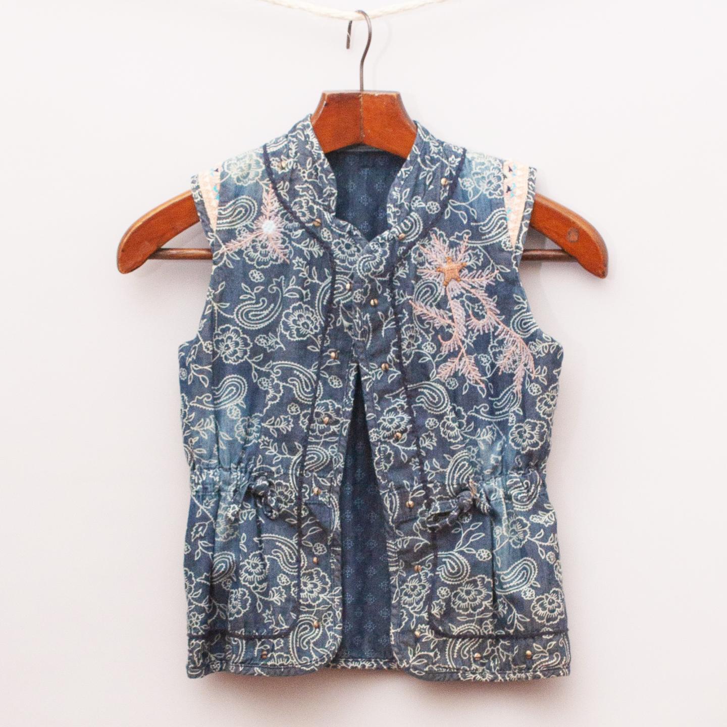 Scotch R'Belle navy blue paisley-style patterned vest with gathered waistband, embroidered shoulders and metal star detail on the front