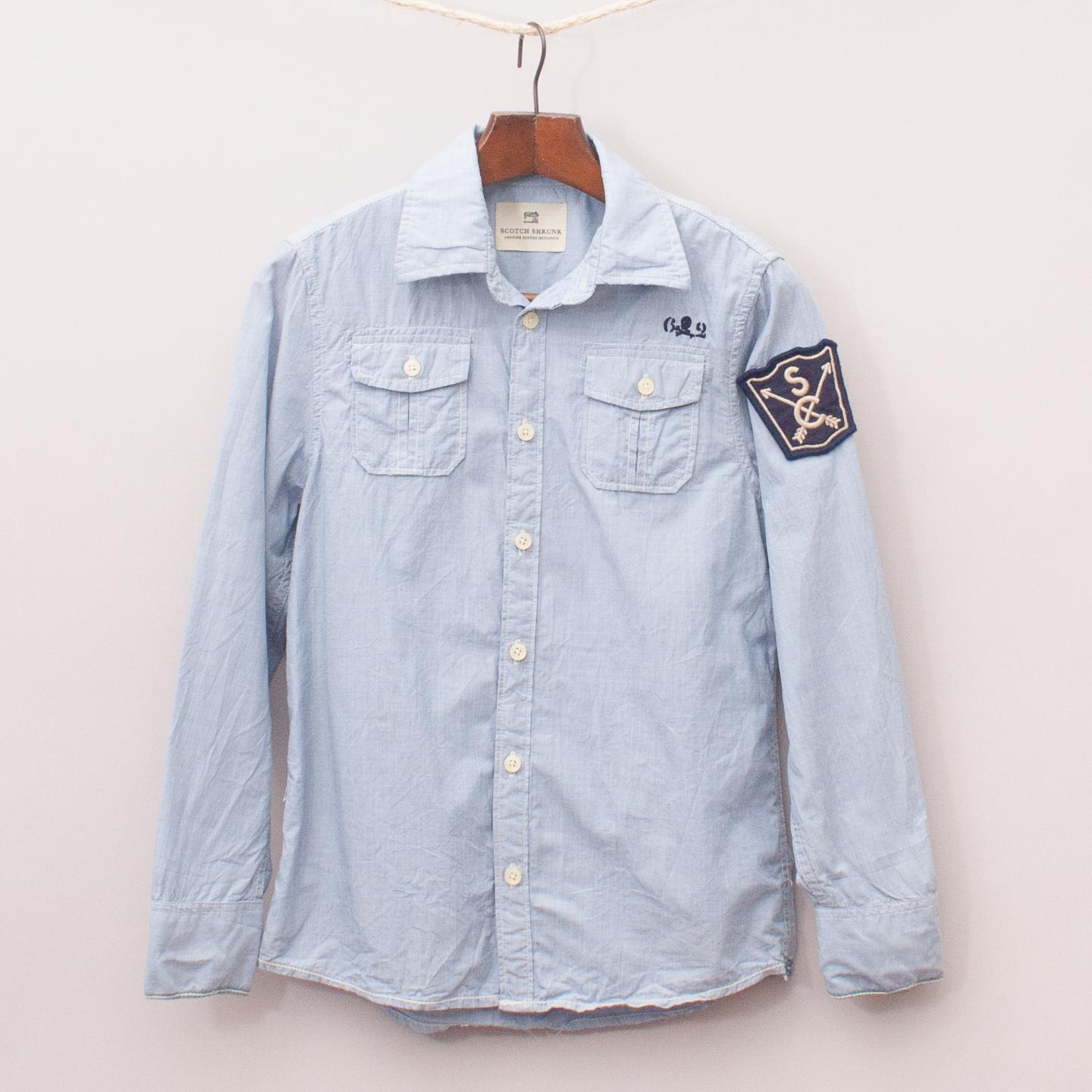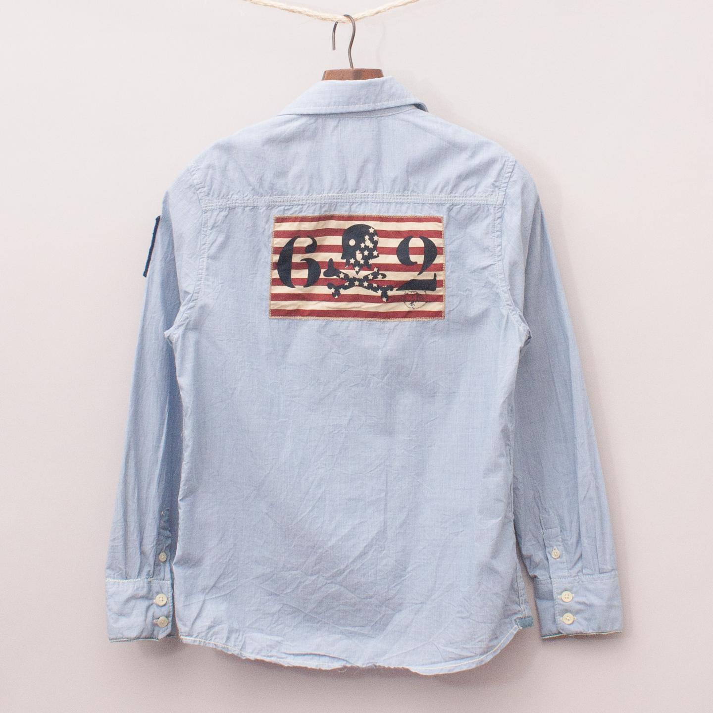 Scotch Shrunk light blue long sleeve shirt with two front pockets, navy blue and embroidered patch on the sleeve, American flag printed on the back and full button down front *100% Cotton
