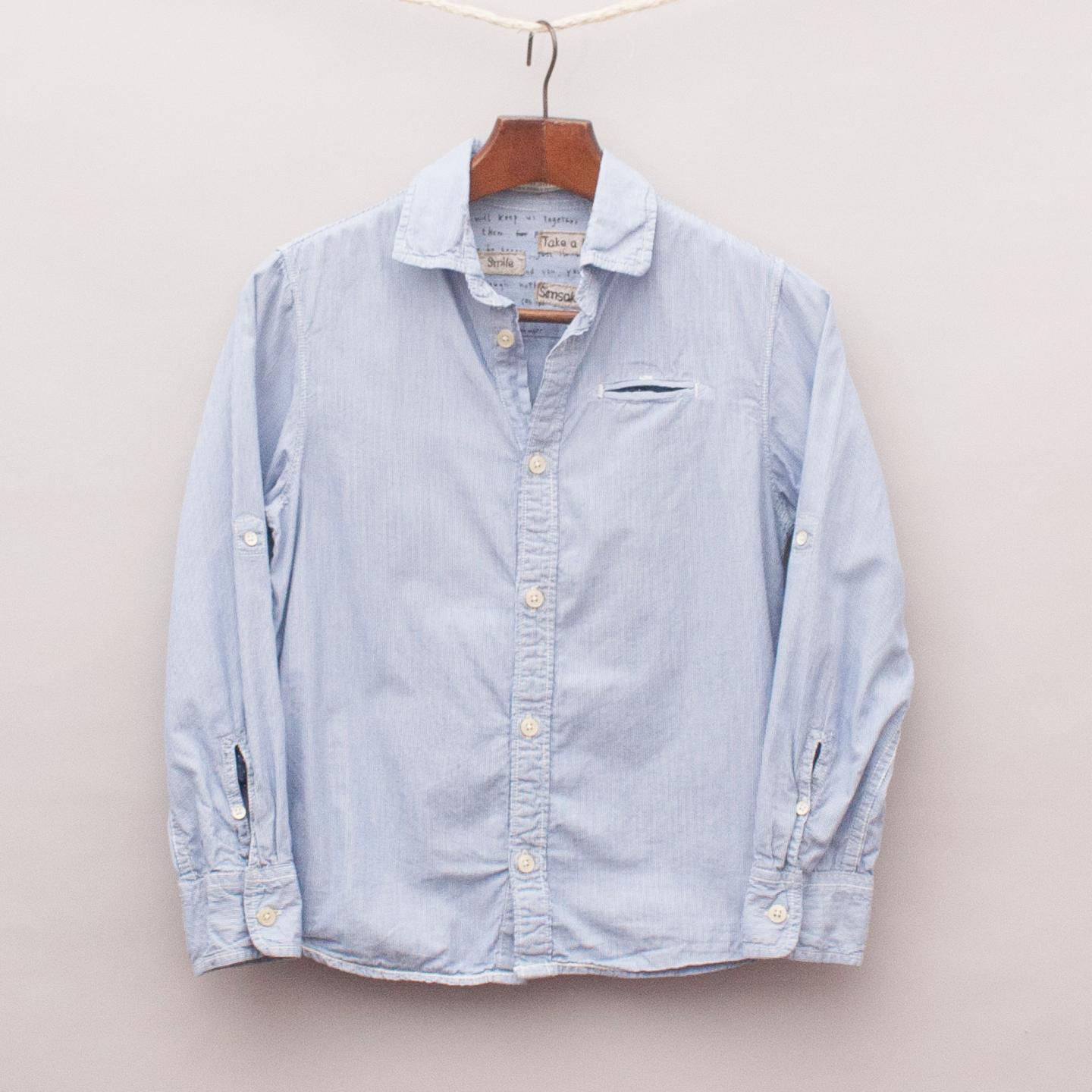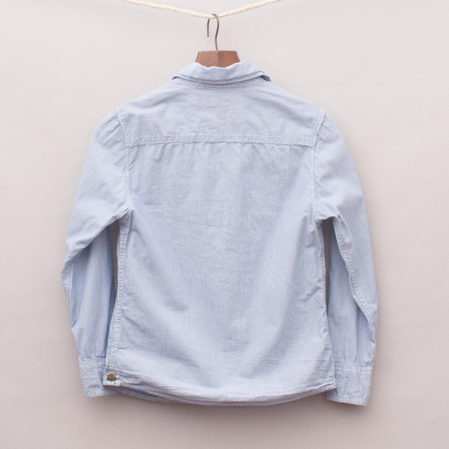 Scotch Shrunk light blue and white striped shirt with single front pocket and full button down front