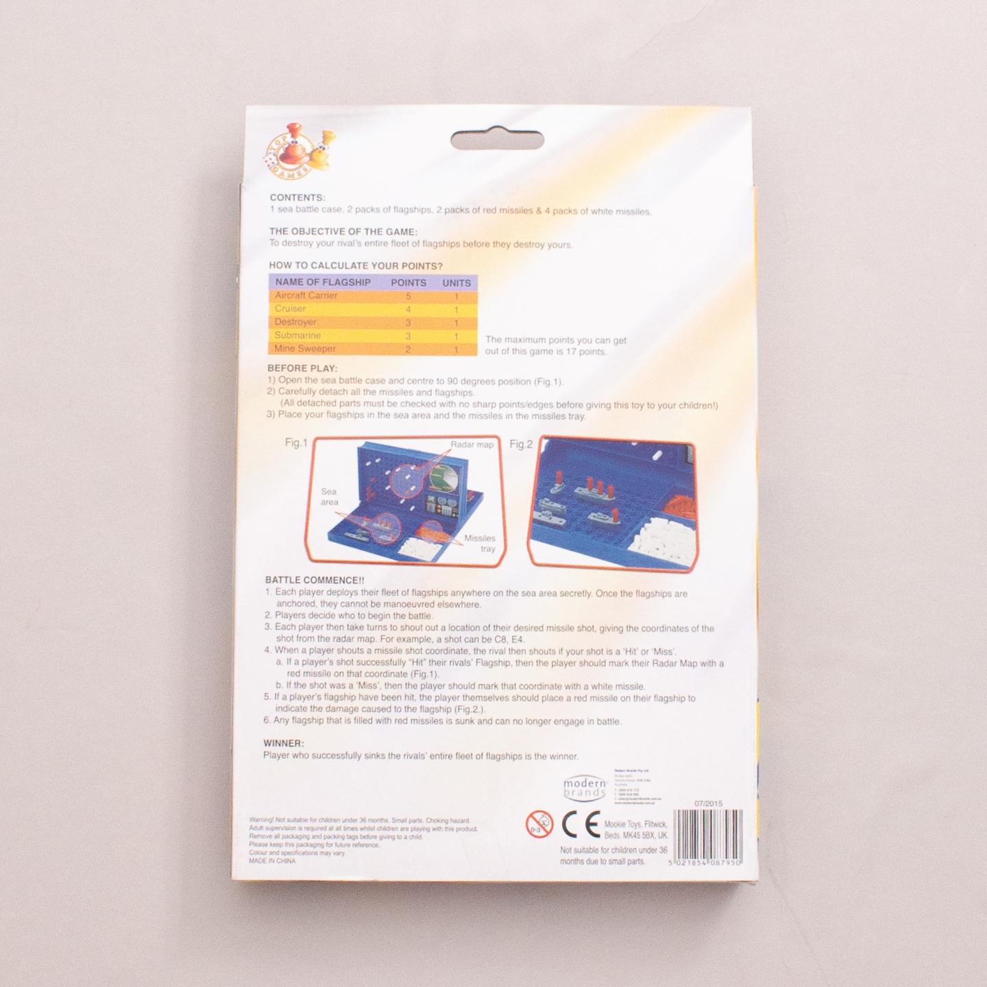 Sea Battle traditional naval strategy game for two players includes; 1 sea battle case, 2 packs of flagships, 2 packs of red missiles and 4 packs of white missiles - Suitable for 3+