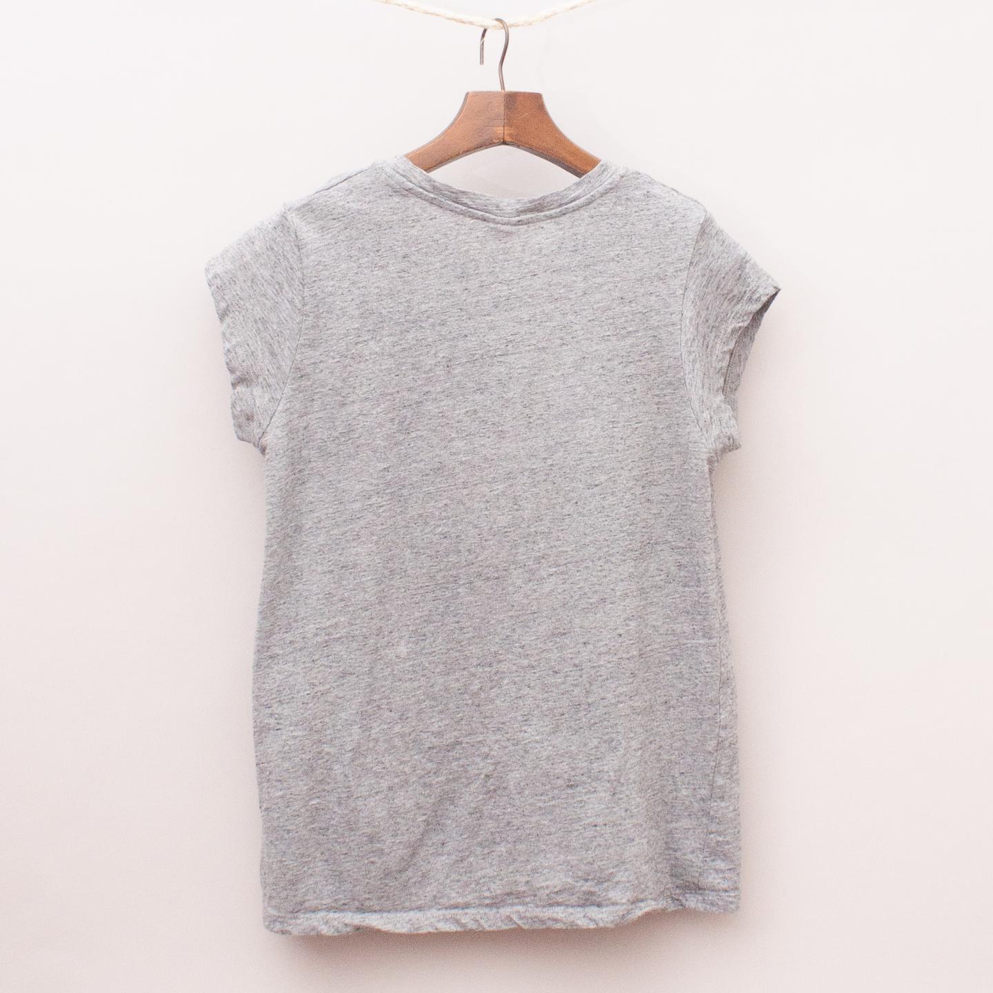 Seed grey t-shirt with cap style sleeves, metallic fleck throughout and embroidered slogan across the front *65% Cotton, 35% Lurex