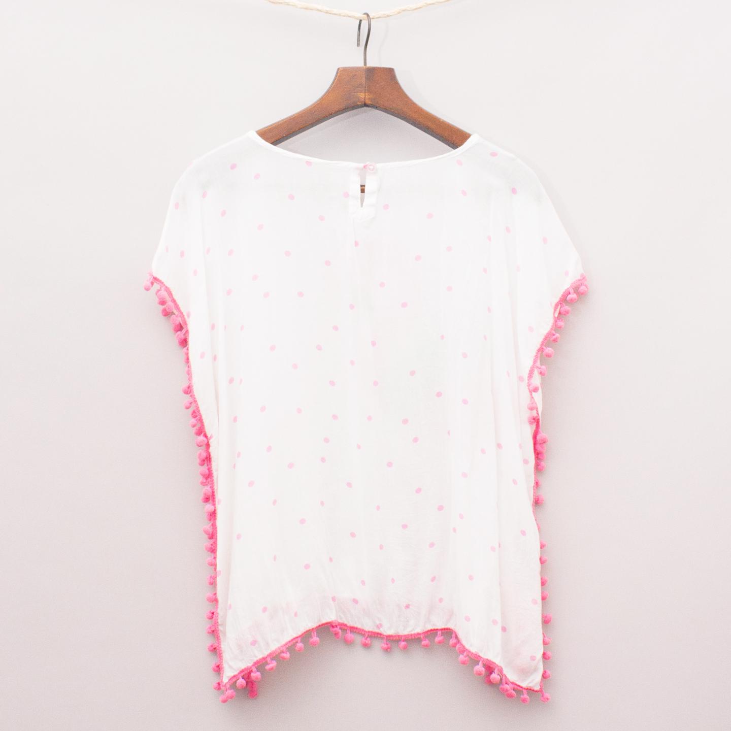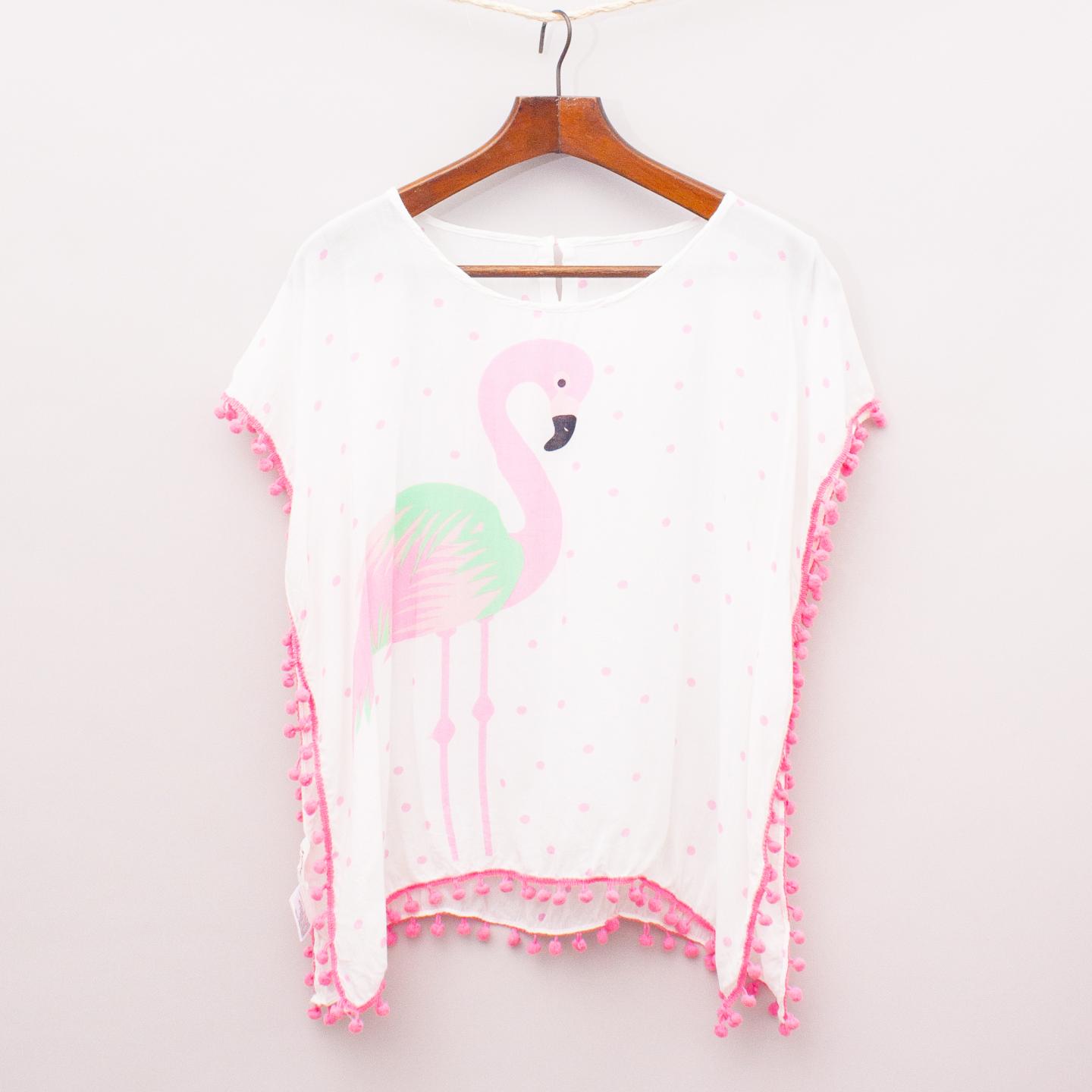 Seed white sheer cover up with pink polka dots and flamingo printed on the front with pink pom pom trim and single button back closure