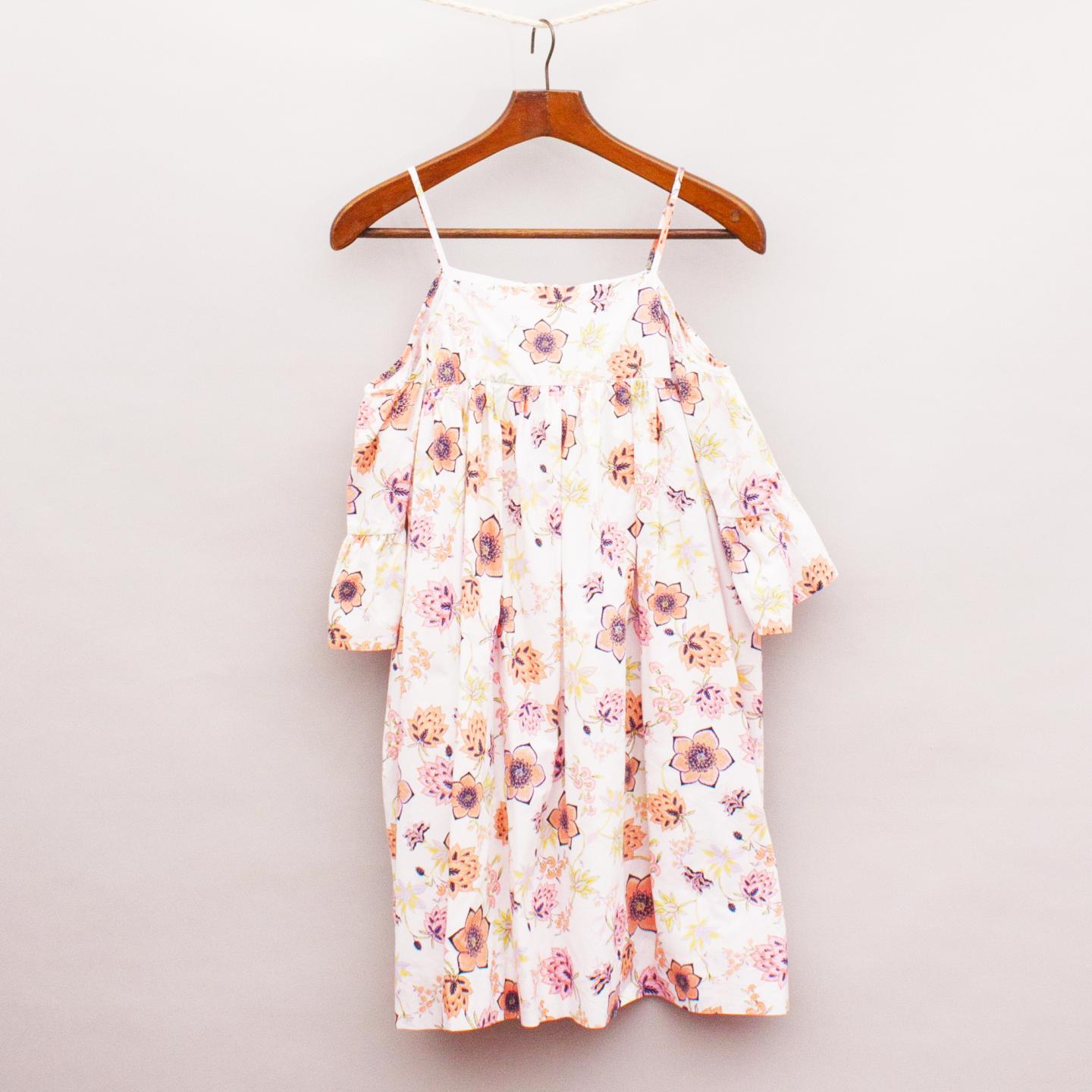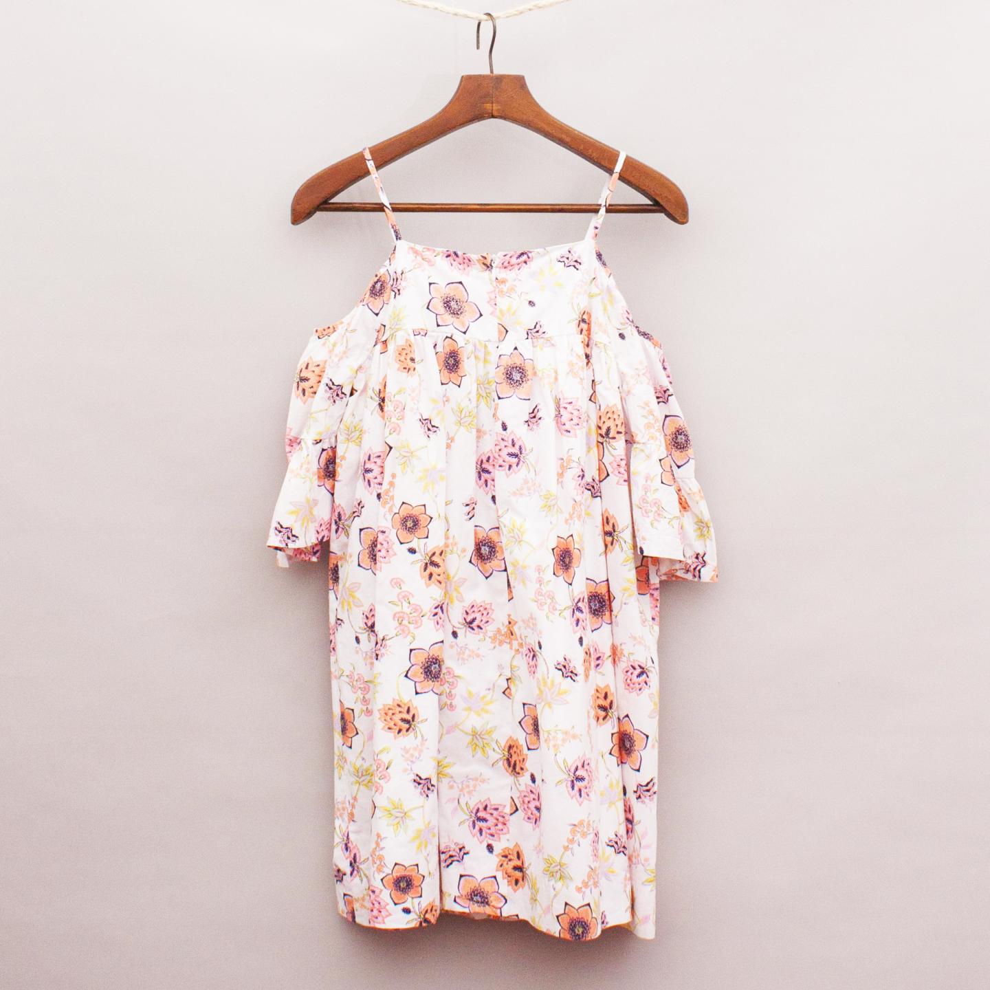 Seed white and floral print dress with off the shoulder sleeves, skinny straps, double layered skirt and zip back closure