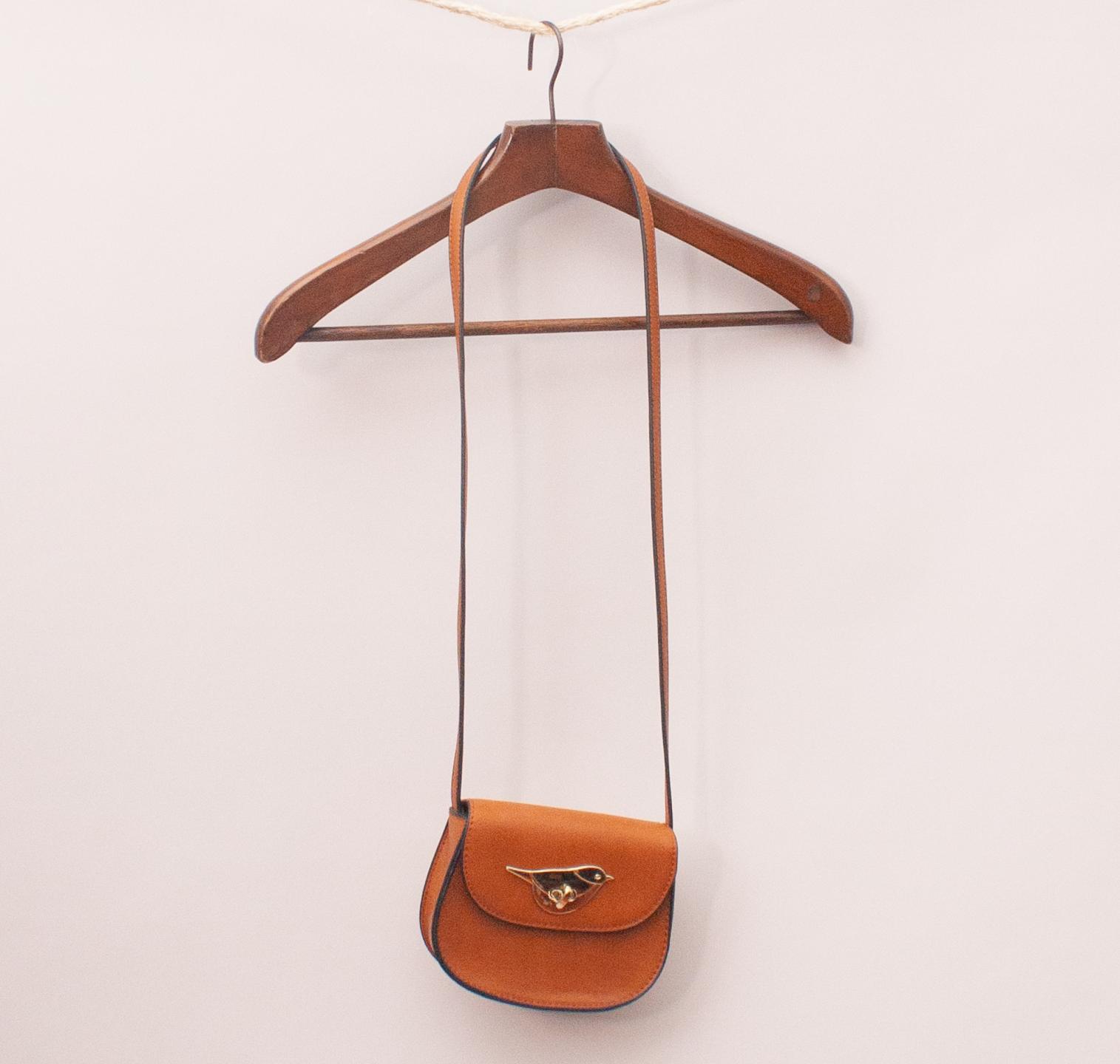 Seed brown leather cross-body bag with gold bird clasp and long shoulder strap