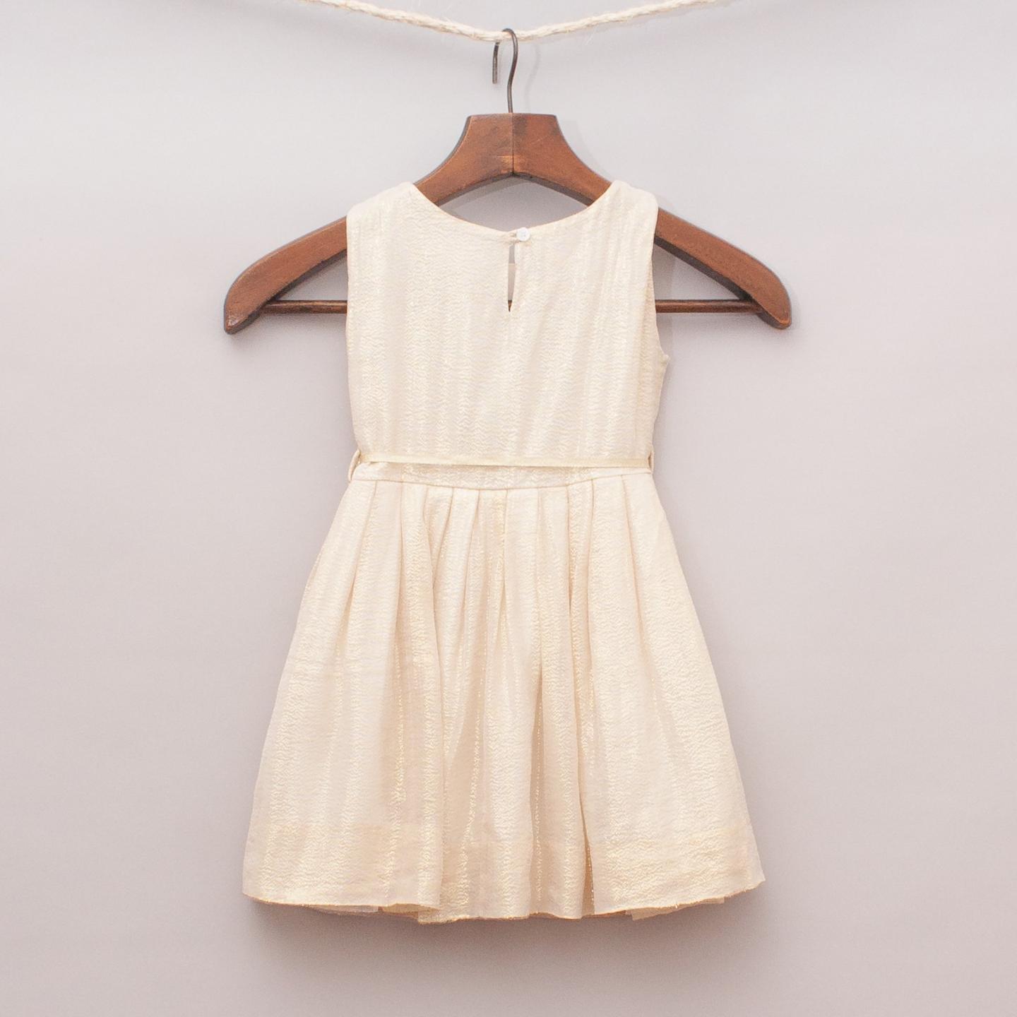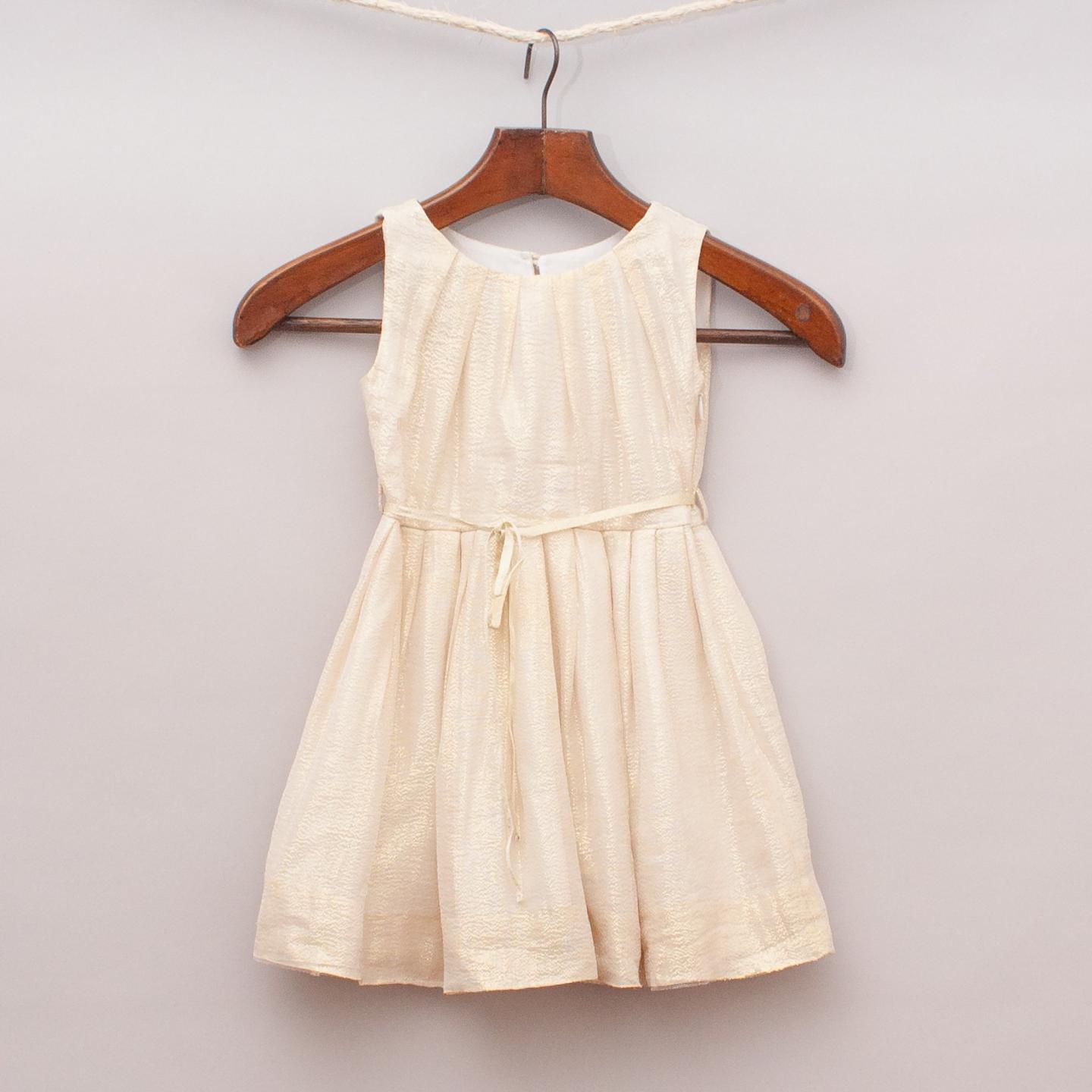 Seed gold thread metallic dress with full skirt, fully lined with tie waist and side zip fastening