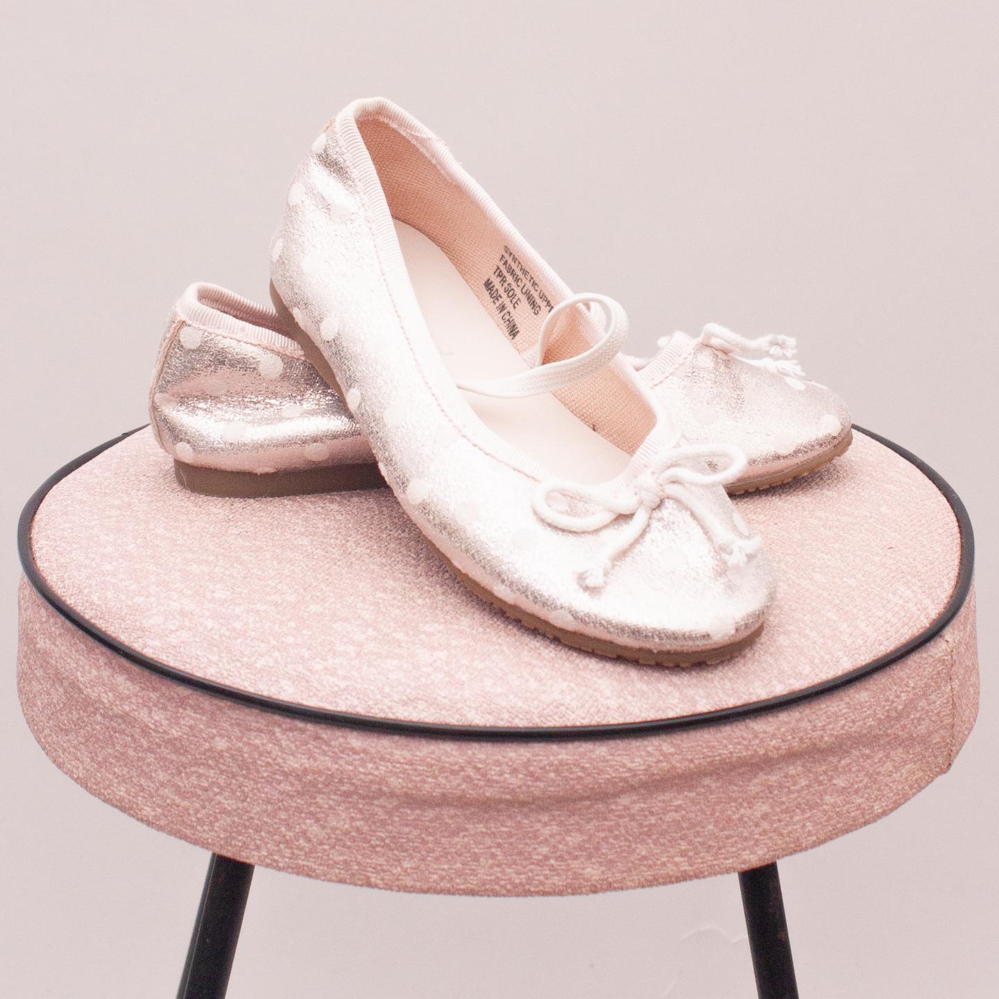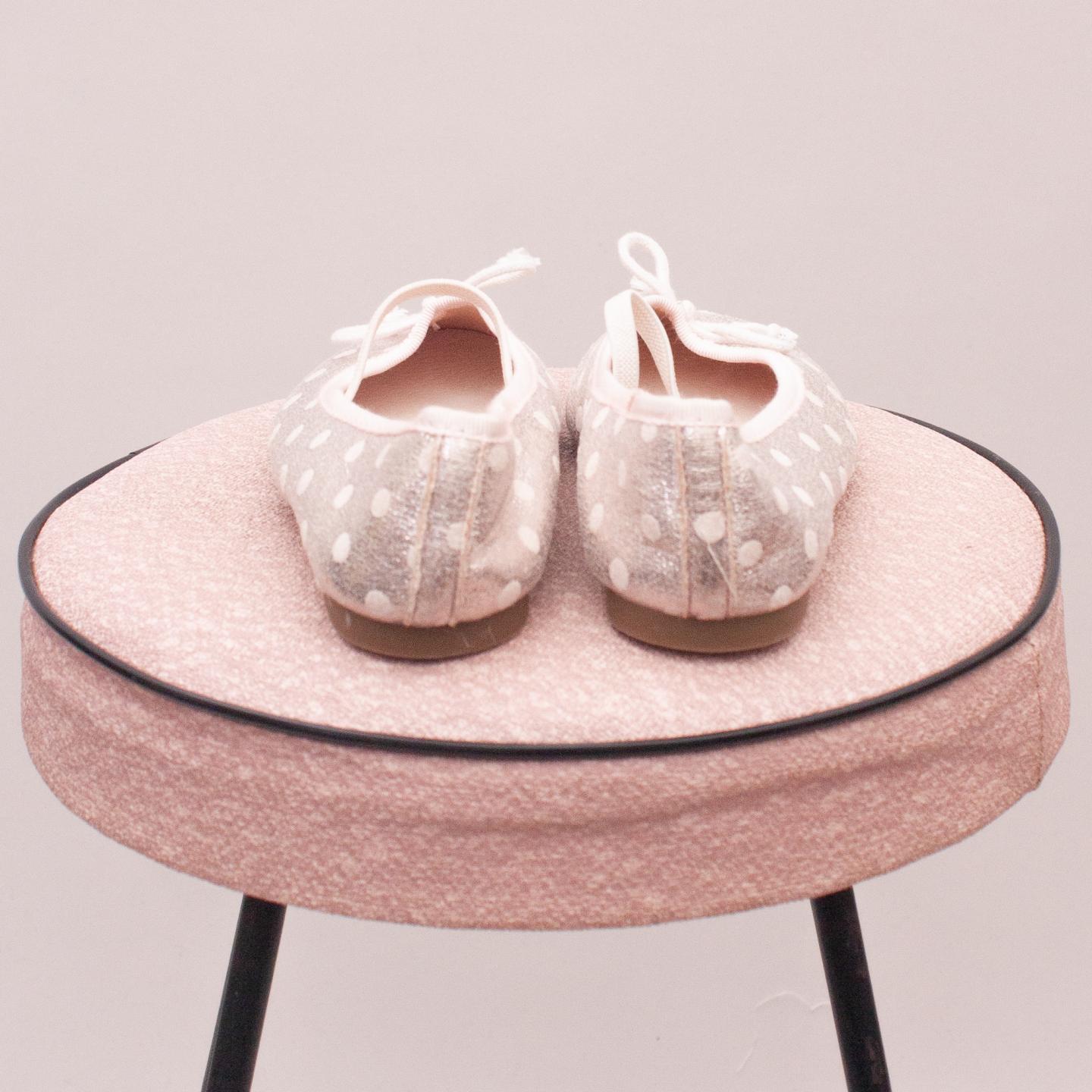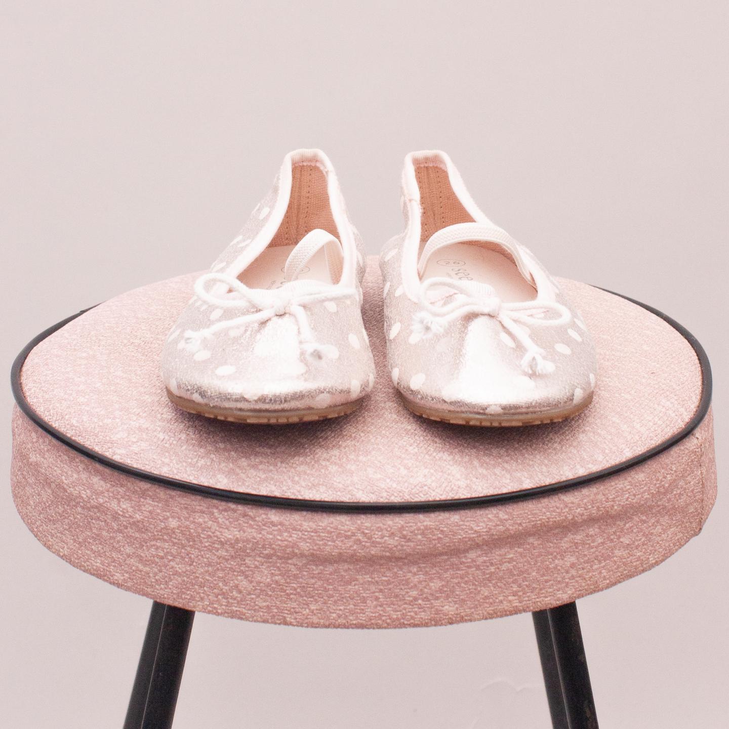 Seed pastel pink metallic and polka dot patterned slip on's with bow on the front and elastic strap - Size EU 26 (Age 3 approx.) *Synthetic outer and fabric lining