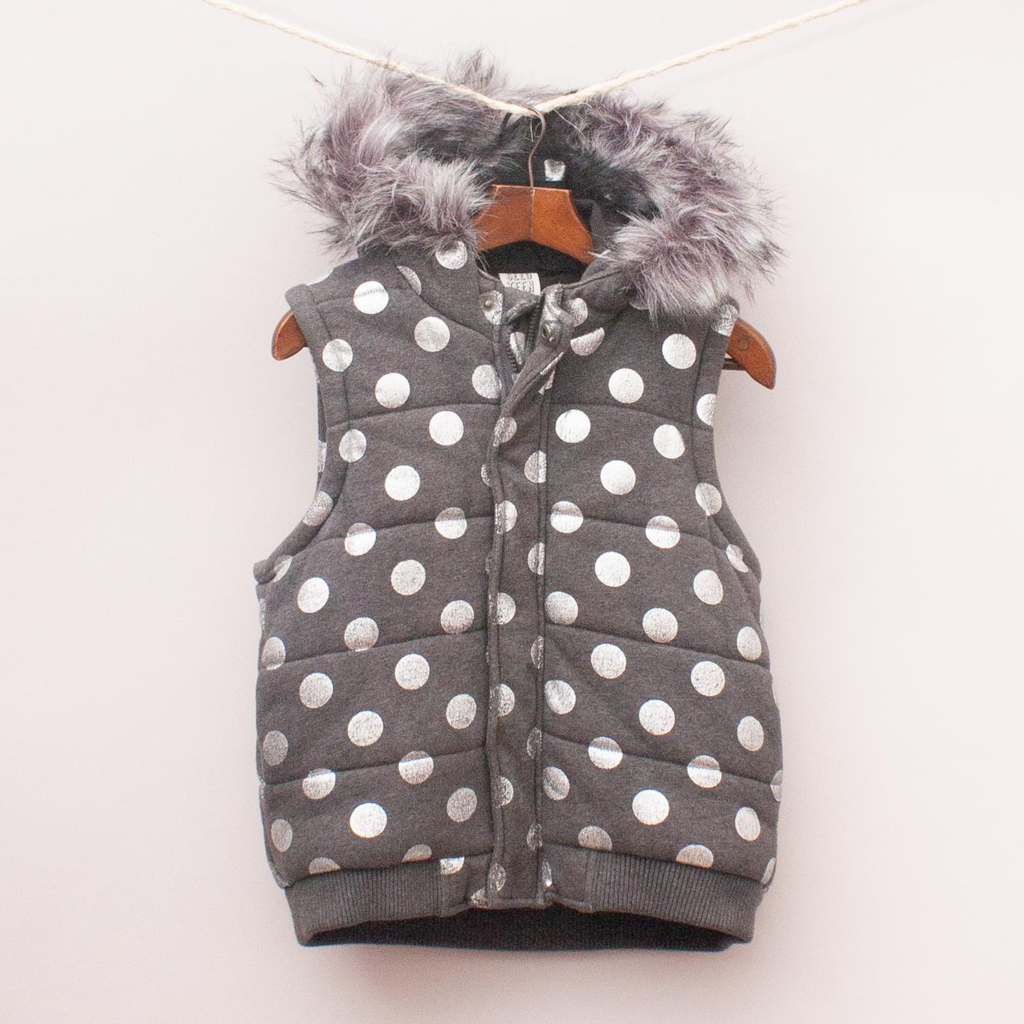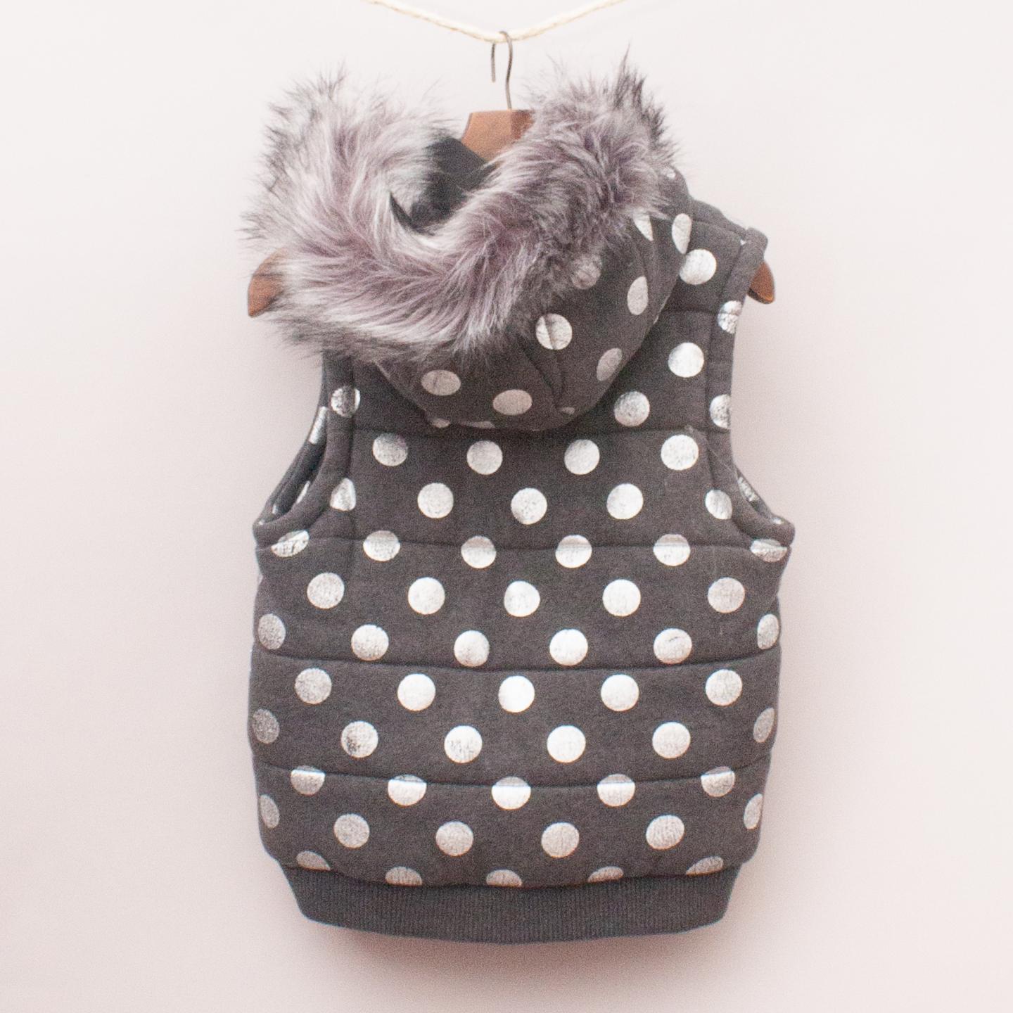 Seed grey padded vest with silver polka dots throughout, faux fur lined hood, two front pockets and full zip up front *100% Cotton