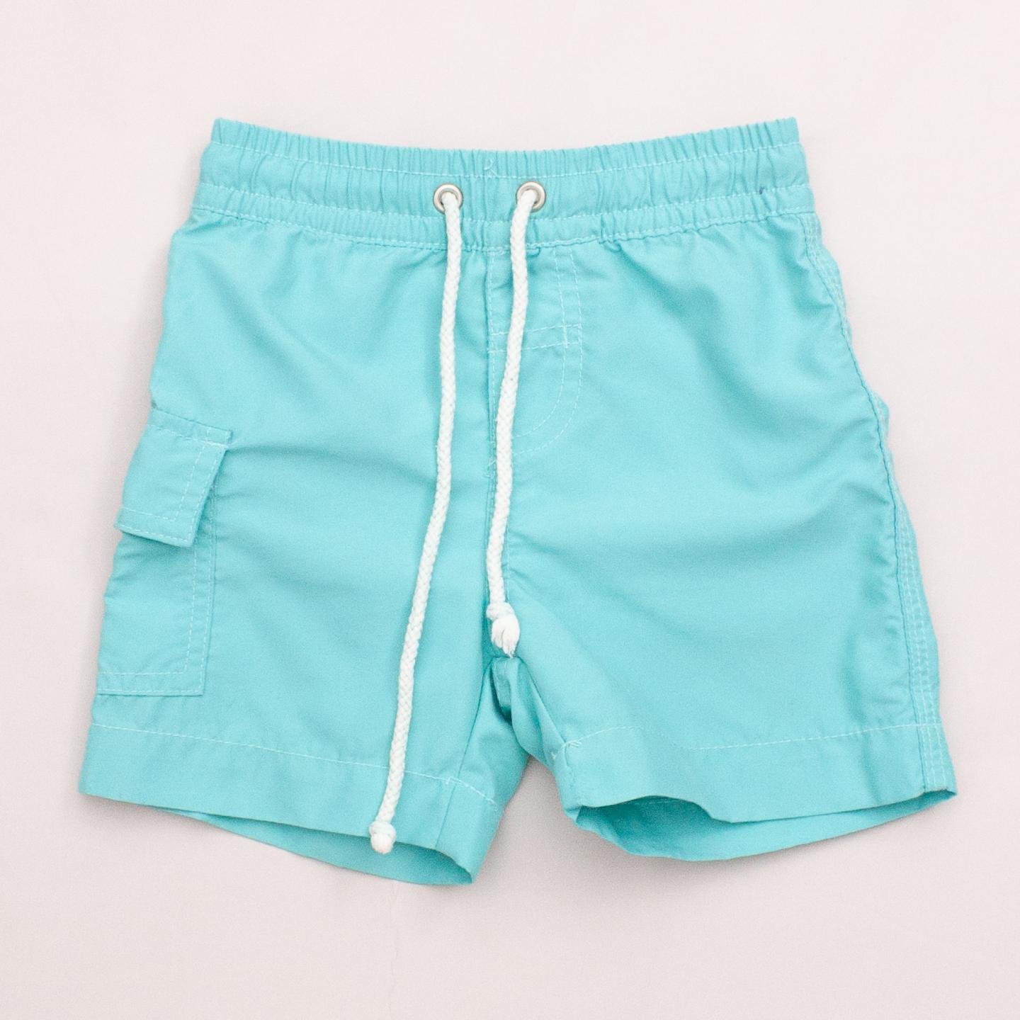 Seed spearmint coloured board shorts with single velcro pocket, embroidered logo on the back and elastic waistband with drawstring