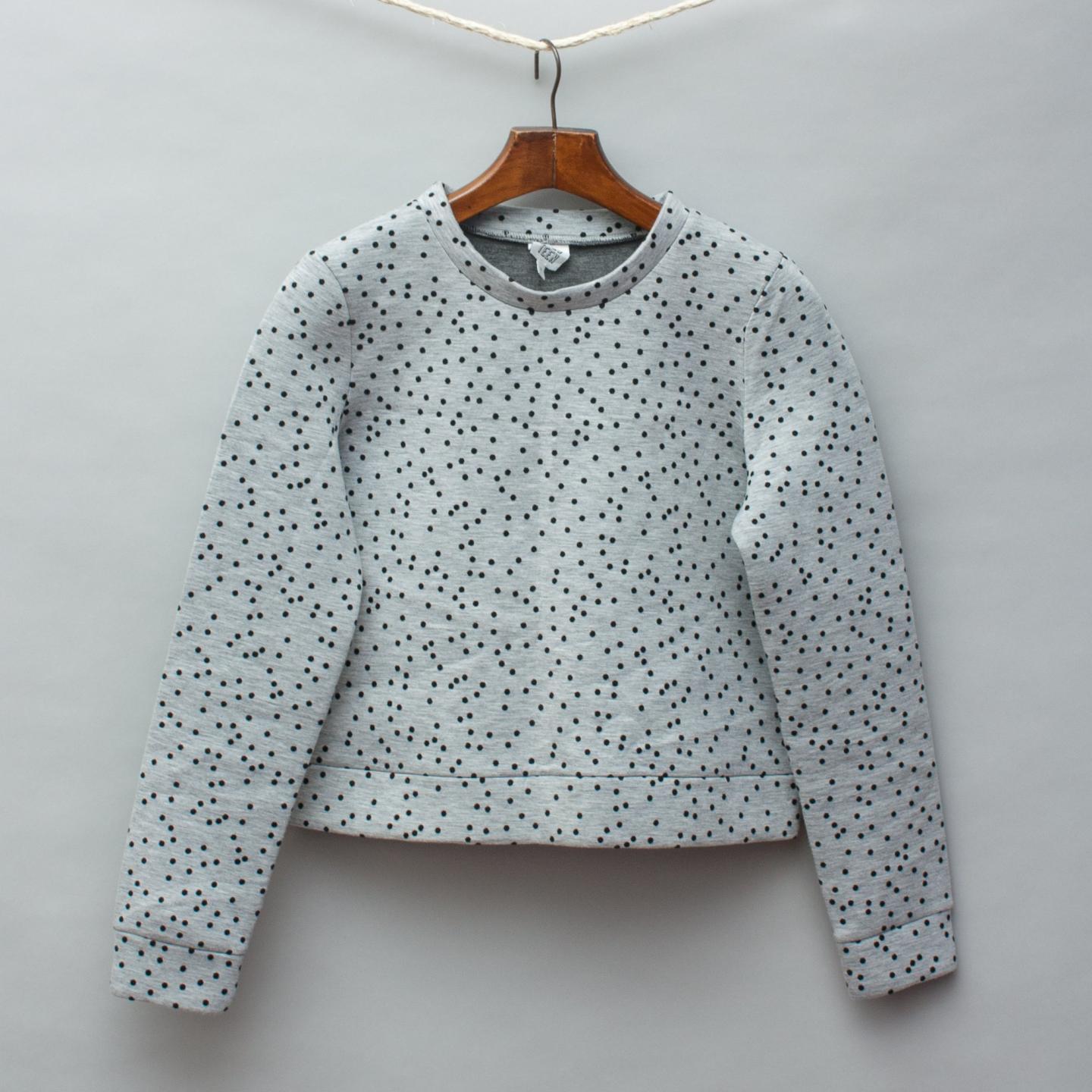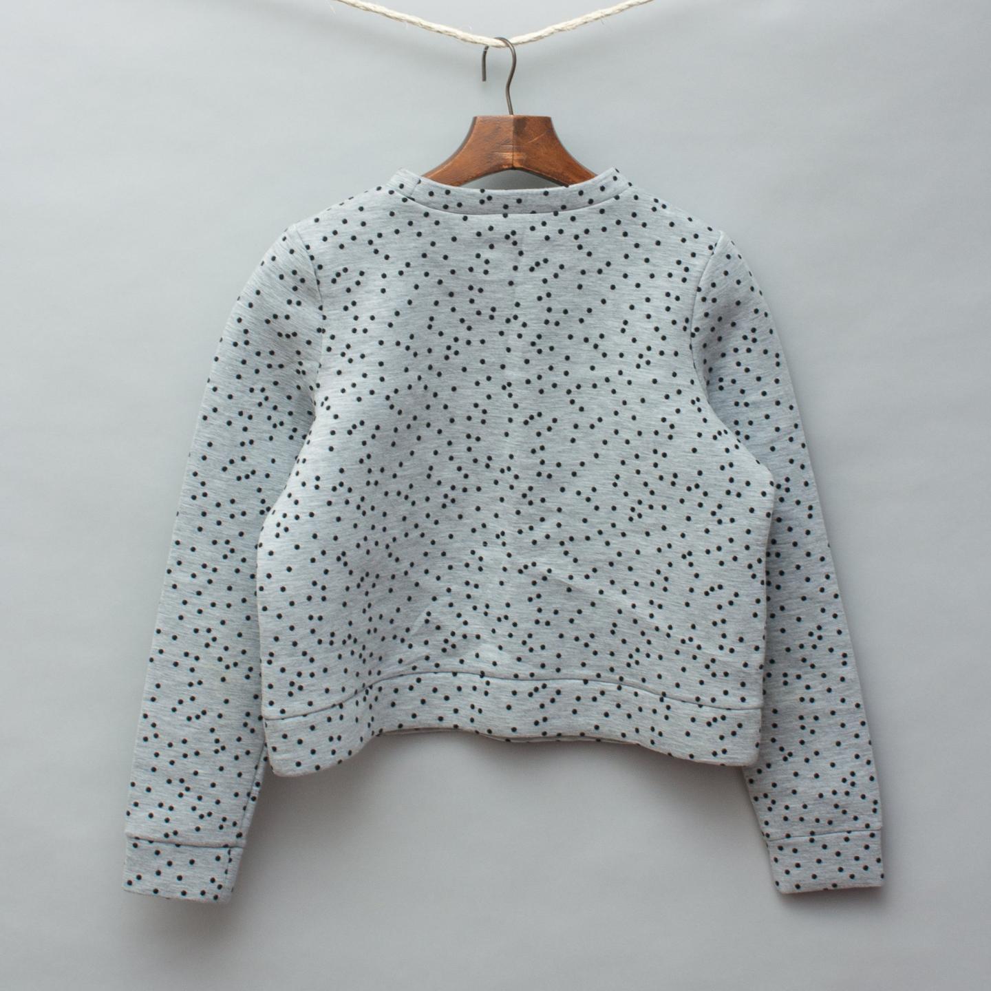 Seed grey jumper with black polka dots throughout, stiff, structured style with some stretch